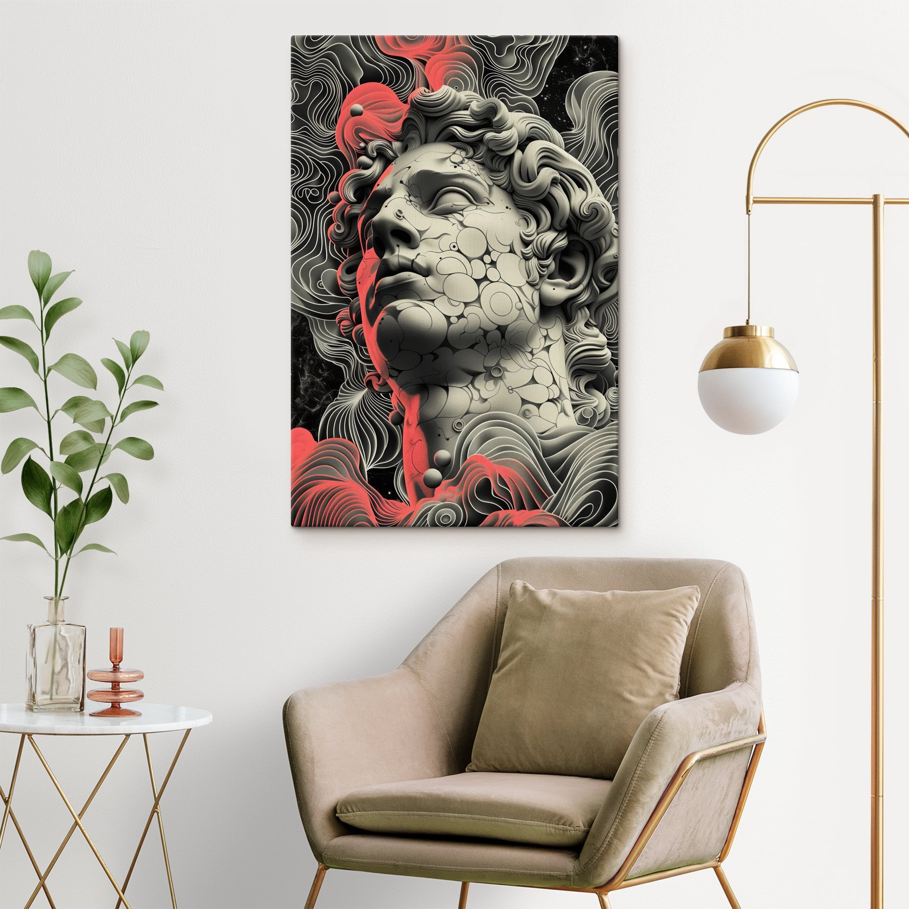 Imaginați-vă o piesă izbitoare care atrage privirea fără efort și stimulează imaginația. Această imprimare pe pânză, care prezintă o statuie a unui bărbat, nu este doar artă; este un starter de conversație. Cu vârtejuri îndrăznețe și curbe moi care dansează în jurul unei figuri clasice, creează un contrast intrigant care șoptește povești vechi, menținând în același timp lucrurile proaspete și moderne.