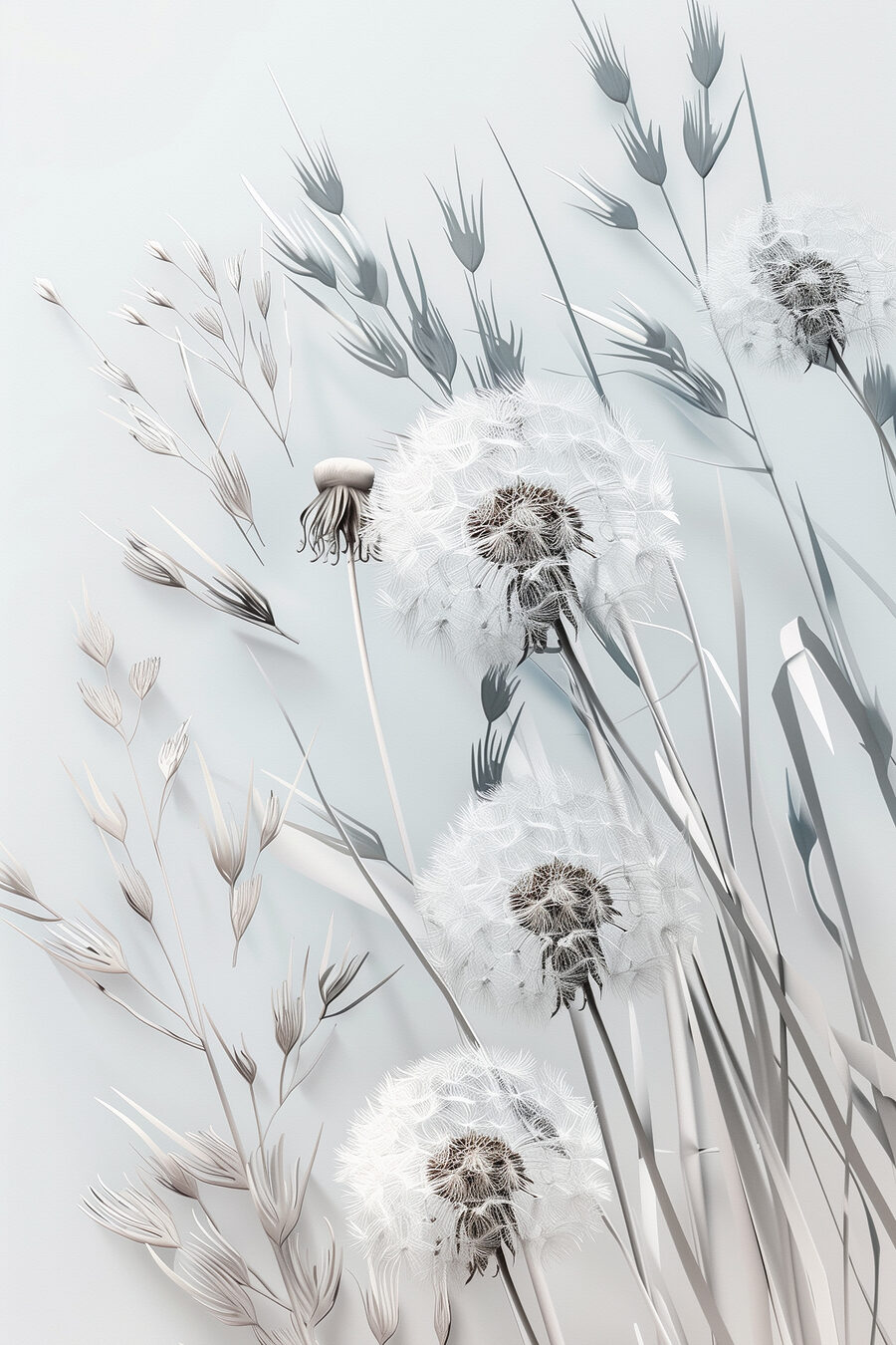 Imaginați-vă această frumusețe senină în camera dvs. de zi – un fundal perfect pentru diminețile leneșe de duminică cu o ceașcă de cafea. Frunzele delicate ale păpădiilor par să se miște cu fiecare privire, dând un sentiment de calm liniștit și eleganță fără efort.