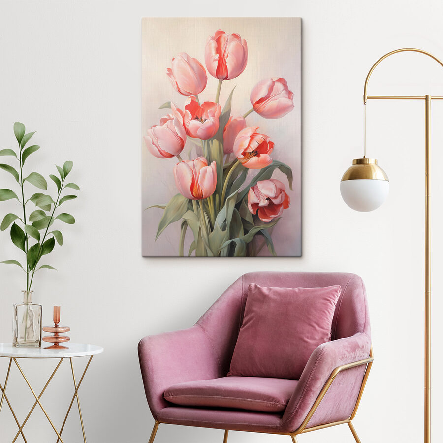 Nu-i așa că acest print pe pânză cu lalele este pur și simplu de vis? Imaginați-vă-l atârnat în spațiul dvs. – luminos, vesel și atât de primitor! Aceste lalele roz și coral sunt pline de viață, legănându-se leneș într-o briză ușoară. Este ca și cum ai avea propriul tău colț de grădină de primăvară pe perete pe tot parcursul anului.