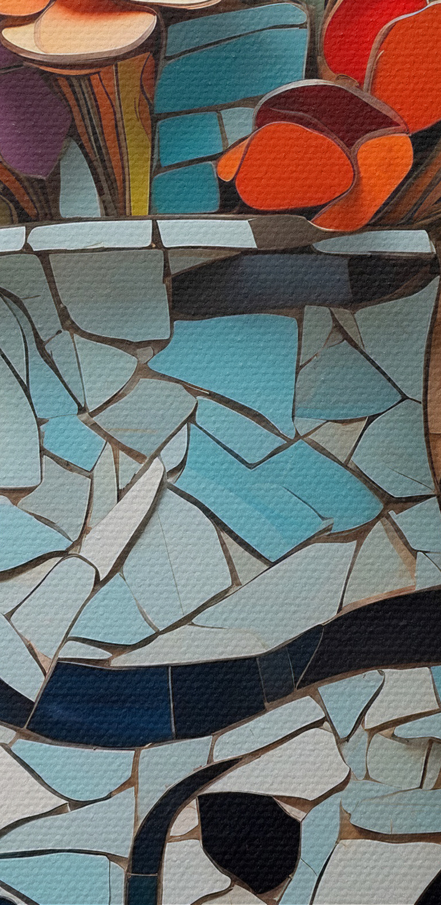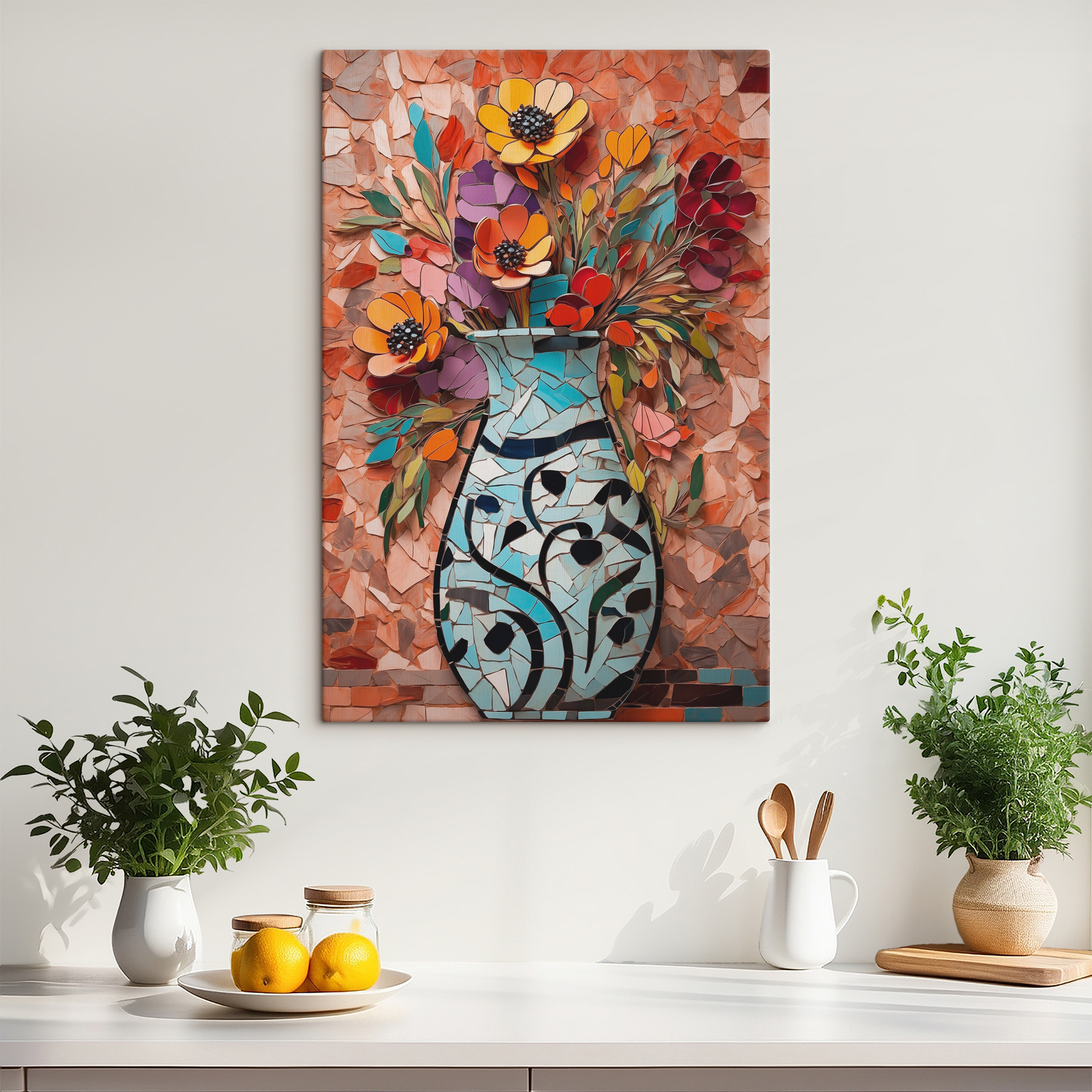 Imaginați-vă acest lucru: spațiul dvs. de locuit împodobit cu acest superb print pe pânză, “Tablouri s39867”. Este ca și cum ai avea un buchet vibrant care nu se ofilește niciodată chiar pe perete! Florile în stil mozaic explodează de culoare – roșii, purpurii și galbene – toate așezate în această vază cu model capricios. Perfectă pentru toți cei care iubesc un pic de natură în interior.