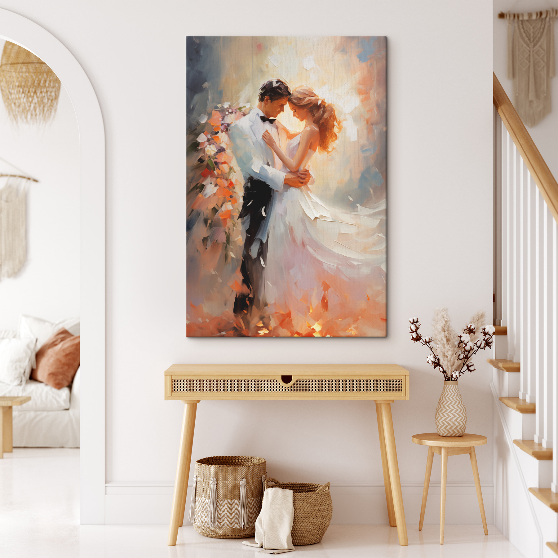 Aduceți o notă de romantism în orice cameră cu această imprimare pe pânză a unui bărbat și a unei femei dansând, captând perfect un moment intim și atemporal. Culorile blânde și fluide creează o căldură care invită la visuri cu ochii deschiși despre cum se învârt sub stele sau se pierd într-un cântec preferat. Imaginați-vă această piesă agățată într-un living confortabil sau deasupra unei mese de luat masa, stârnind conversații despre povești de dragoste și amintiri speciale. Nu este doar artă; este o vibrație. Perfectă pentru oricine apreciază momentele frumoase ale vieții, această imprimare va atrage cu siguranță privirile și inimile deopotrivă.