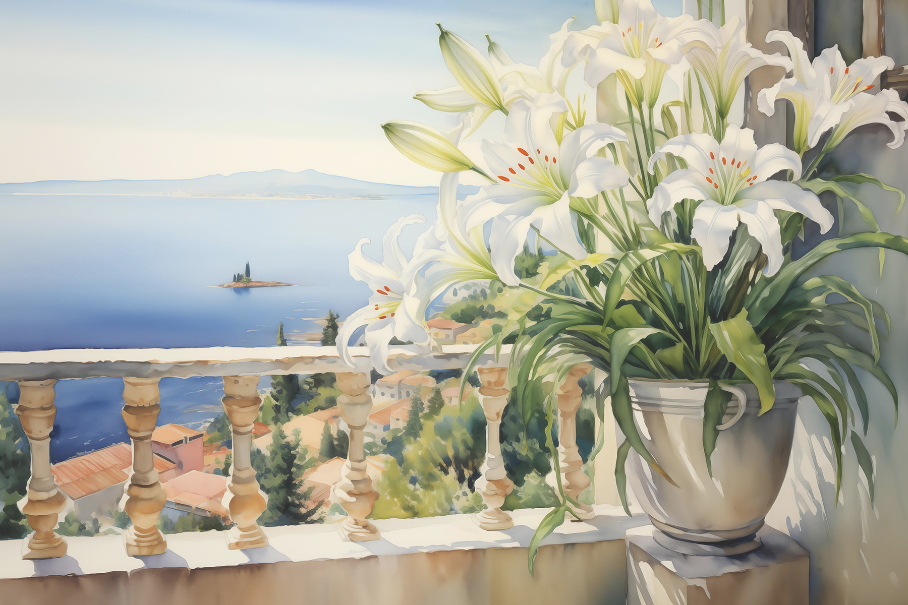 Ați visat vreodată să evadați la un balcon mediteranean de vis fără să vă părăsiți camera? Aceasta este magia pe care o aduce această pânză! Imaginați-vă crini albi strălucitori, plini de bucurie în prim-plan, făcându-vă practic cu mâna de pe o terasă însorită. Aproape că poți auzi șoaptele suave ale valurilor mării și simți briza blândă foșnind printre acele petale delicate. Nu este doar artă – este o mică vacanță pe peretele tău. Perfect pentru a adăuga o notă de liniște sufrageriei, dormitorului sau chiar biroului tău – îți ridică starea de spirit instant! Și hei, cui nu i-ar plăcea să se trezească la această priveliște senină în fiecare zi? Beatitudine pură. 🌸🌊