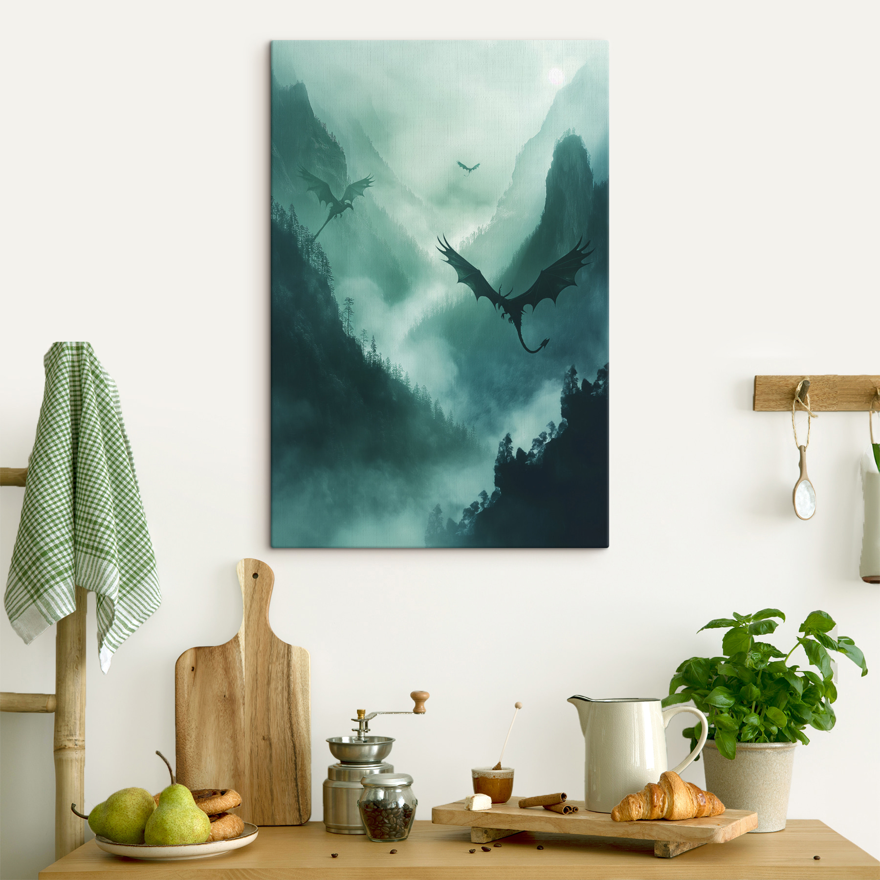 Transformați-vă spațiul cu această pânză captivantă cu dragoni înălțându-se pe un cer cețos. Este ca și cum ai invita un pic de magie chiar în casa ta. Imaginați-vă că vă relaxați cu o carte bună în timp ce aceste creaturi mitice dansează deasupra într-o lume în care totul este posibil. Verdele intens și griul moale al acestei opere de artă creează o atmosferă liniștitoare, perfectă pentru visare sau pentru relaxare după o zi lungă. Nu este doar artă; este o evadare. De fiecare dată când vă uitați la ea, s-ar putea să simțiți un fior de aventură care vă stârnește imaginația. Perfect pentru orice cameră care are nevoie de o notă de uimire!