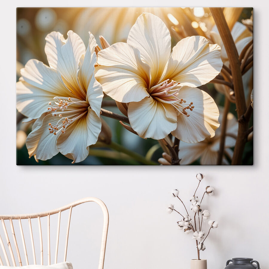 Înveseliți orice cameră cu “Tablouri Sunlit blooms dance in light.” Această piesă surprinde îmbrățișarea blândă a luminii soarelui în timp ce aceasta se filtrează prin flori delicate. Imaginați-vă că intrați în spațiul dvs. și simțiți că ați pășit într-o grădină însorită. Nuanțele calde și petalele moi invită la liniște pură, făcând-o perfectă pentru spațiile care au nevoie de puțină seninătate. Agățați-o deasupra unui colț de lectură confortabil sau lăsați-o să fie punctul central al unei camere de zi pline de viață. Oricum ar fi, ar putea inspira un zâmbet sau două, ca să nu mai vorbim de niște visuri cu ochii deschiși despre plimbările de primăvară. Un adevărat starter de conversație, această artă pe pânză adaugă o notă de farmec al naturii în interior. Cine nu și-ar dori să împartă o cameră cu o asemenea frumusețe?