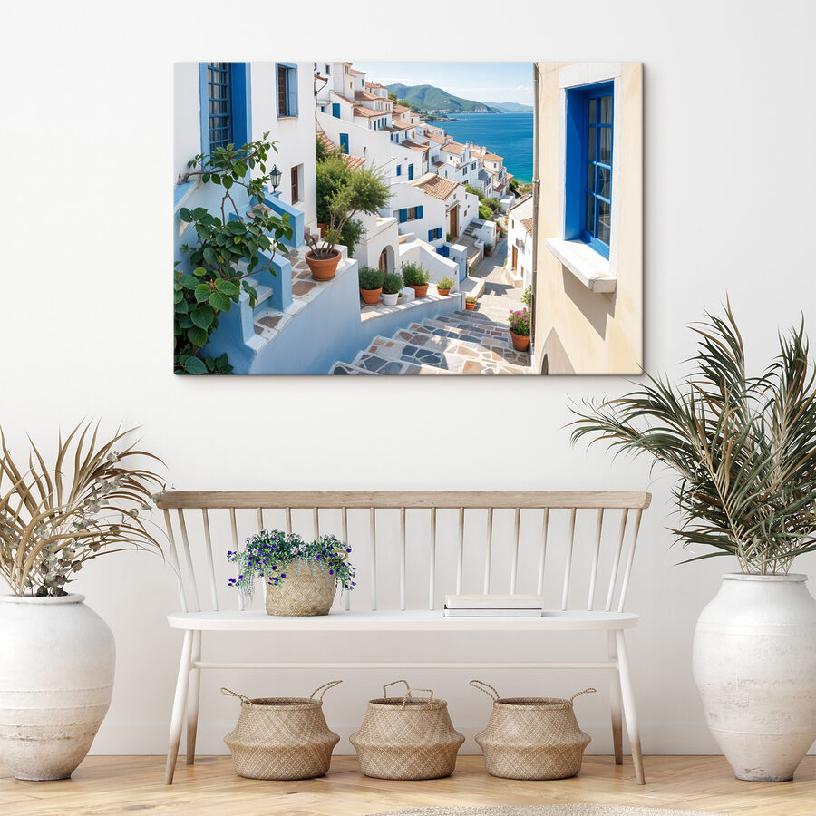 Intrați într-o lume fermecătoare cu această imprimare pe pânză a unei scări pitorești care șerpuiește printr-un oraș încântător. Fiecare răsucire atrage privirea, invitând la visarea cu ochii deschiși a după-amiezilor însorite și a conversațiilor șoptite la cafea. Accentele de albastru ar putea înveseli chiar și cea mai morocănoasă zi de luni. Imaginați-vă această piesă într-un colț confortabil, stârnind conversații despre călătorii și aventuri – cine nu ar vrea să vorbească despre un loc care pare un refugiu secret? Este ca și cum ai aduce o felie de soare chiar în casa ta, perfectă pentru cei care iubesc un pic de dorință de călătorie în decorul lor. Fiecare privire ne amintește de frumusețea care ne așteaptă chiar în fața ușii.