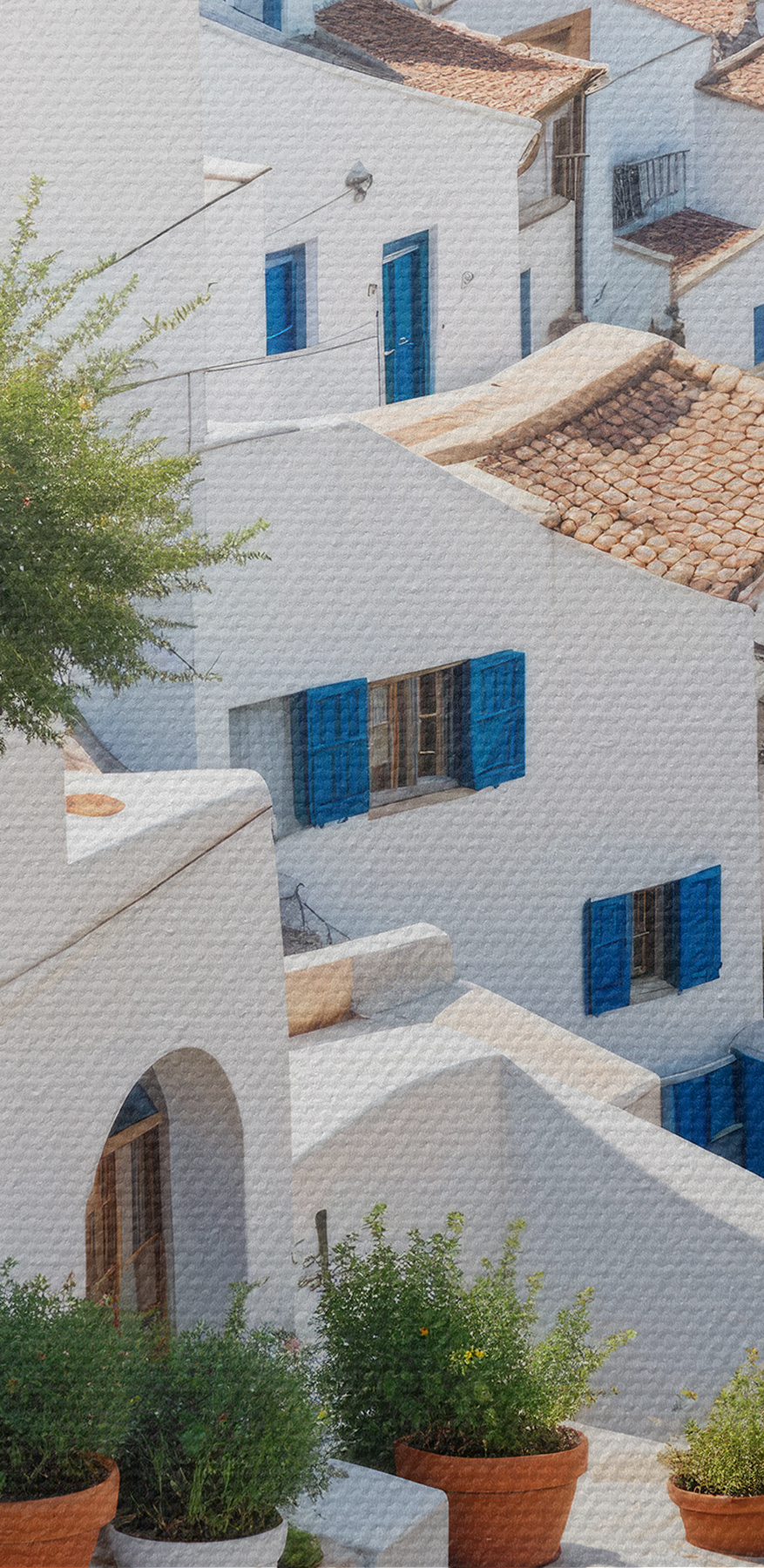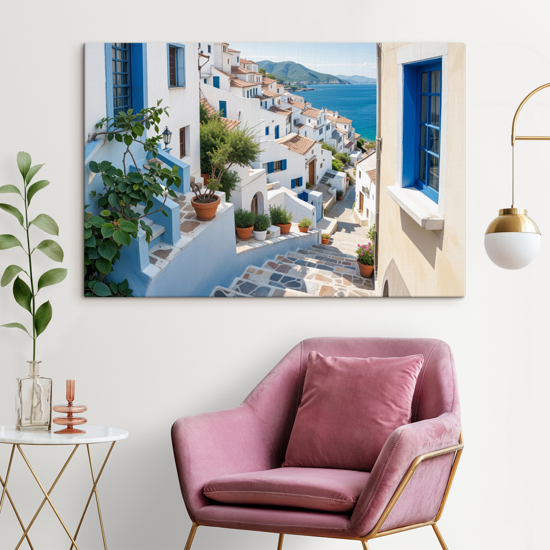 Intrați într-o lume fermecătoare cu această imprimare pe pânză a unei scări pitorești care șerpuiește printr-un oraș încântător. Fiecare răsucire atrage privirea, invitând la visarea cu ochii deschiși a după-amiezilor însorite și a conversațiilor șoptite la cafea. Accentele de albastru ar putea înveseli chiar și cea mai morocănoasă zi de luni. Imaginați-vă această piesă într-un colț confortabil, stârnind conversații despre călătorii și aventuri – cine nu ar vrea să vorbească despre un loc care pare un refugiu secret? Este ca și cum ai aduce o felie de soare chiar în casa ta, perfectă pentru cei care iubesc un pic de dorință de călătorie în decorul lor. Fiecare privire ne amintește de frumusețea care ne așteaptă chiar în fața ușii.