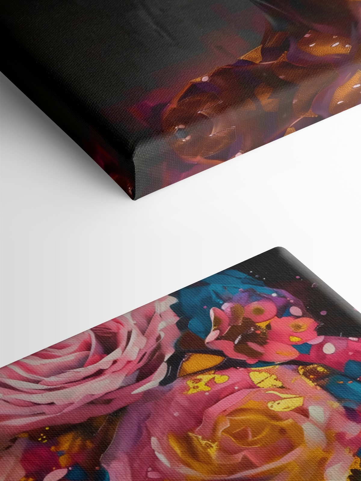 Imaginați-vă această imprimare uimitoare pe pânză în spațiul dvs. – “Tablouri s40182” este ca un vis vibrant devenit realitate. Modul în care florile se îmbină cu expresia senină a subiectului este absolut captivant. Este ca și cum culorile și texturile dansează pe pânză, invitându-vă să vă pierdeți în frumusețea sa.
