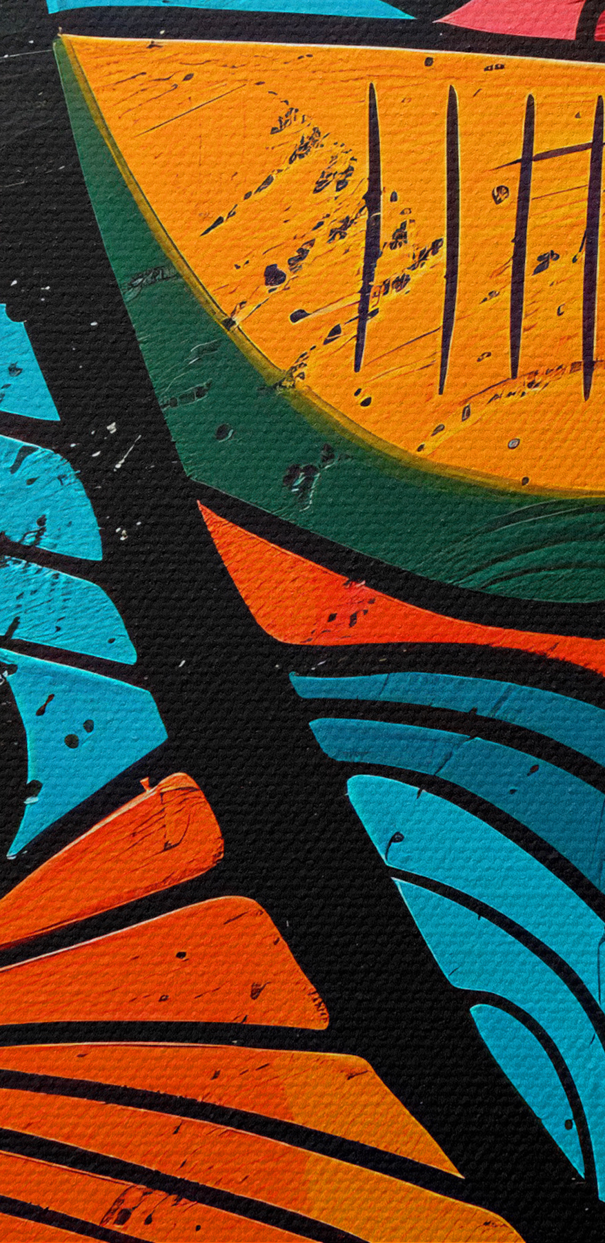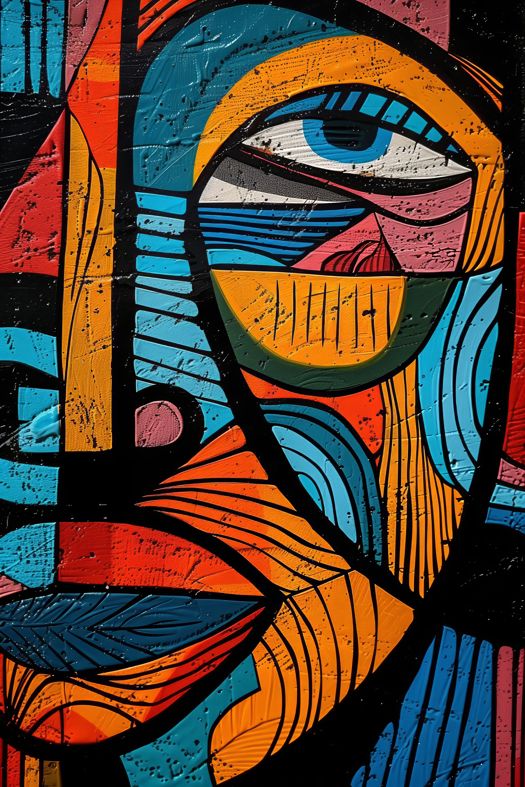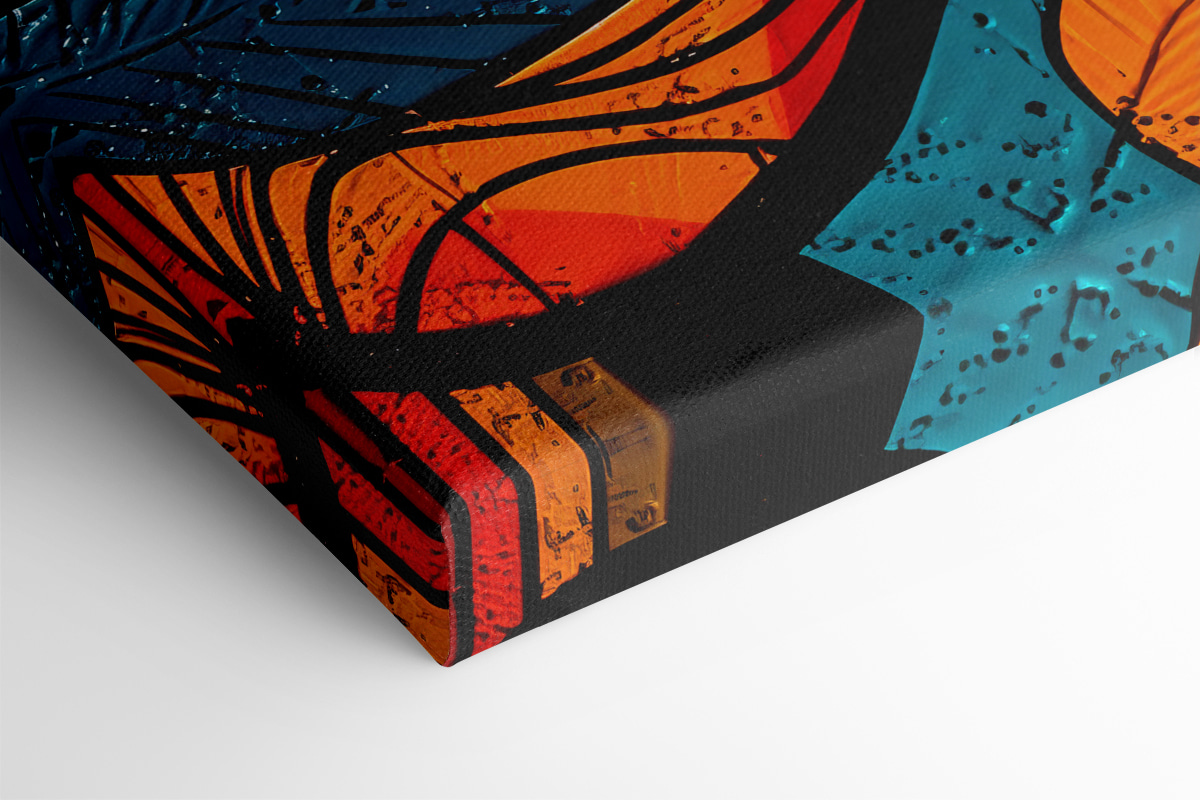 Imaginați-vă că ajungeți acasă după o zi lungă, vă așezați pe canapeaua confortabilă și vedeți această piesă plină de viață pe perete… Este ca un stimulent vizual. Amestecul de culori – albastru, portocaliu, roșu – explodează, nu-i așa? E ca și cum te-ai uita într-o galerie de artă modernă, doar că e chiar acolo, în sufrageria ta.
