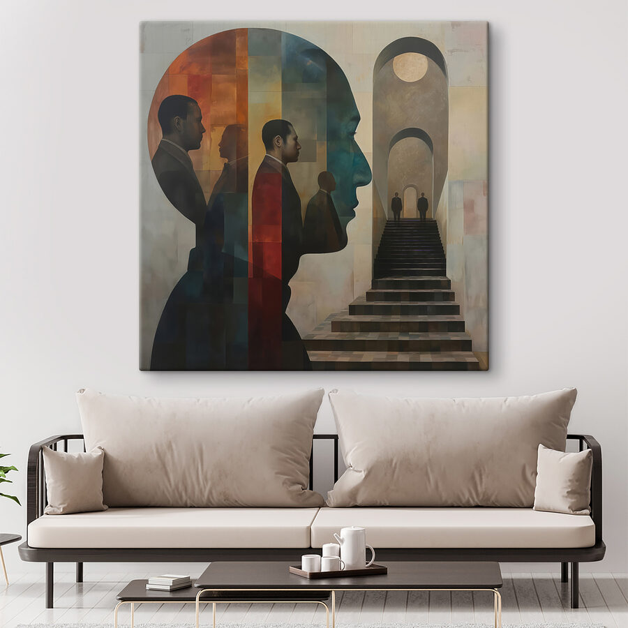 Pătrundeți într-o lume a gândurilor cu acest print pe pânză care este mai mult decât o simplă decorațiune. Acesta prezintă chipul unui bărbat uimitor alături de o scară – un fel de ghicitoare vizuală, nu-i așa? Amestecul de culori îl face să pară viu, aproape ca și cum te-ar invita să intri în scenă. Imaginați-vă ce conversații ar putea stârni. Este perfectă pentru sufragerii confortabile sau chiar ca o declarație îndrăzneață într-un spațiu de birou. Și, hei, cine nu și-ar dori un memento zilnic pentru a continua să urce scările vieții? Un dram de creativitate poate transforma orice perete într-o pânză a inspirației!