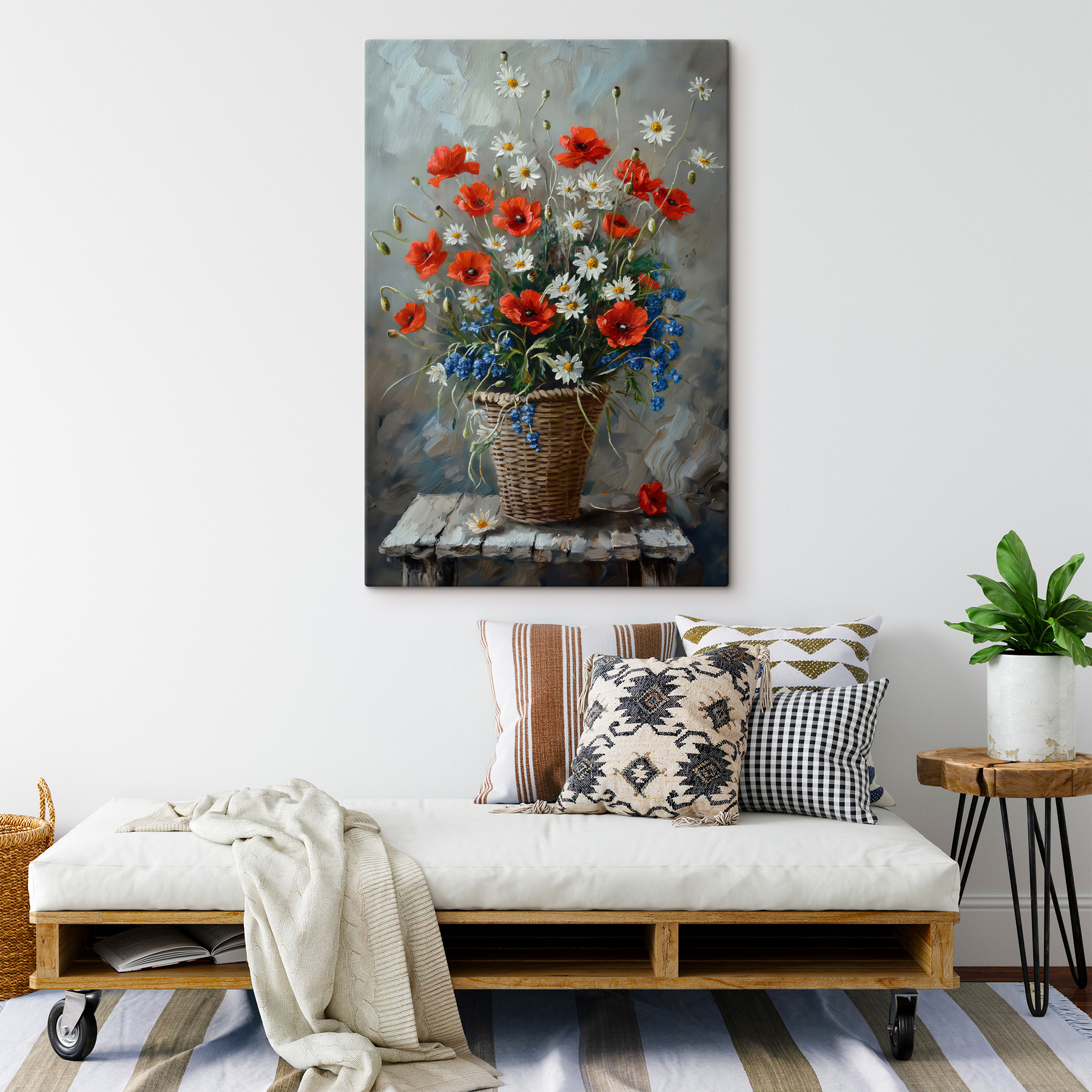Înveseliți orice cameră cu această imprimare veselă pe pânză a florilor într-un coș. Imaginați-vă că vă plimbați printr-o grădină confortabilă, unde stropii de roșu, albul însorit și albastrul vibrant dansează în fața ochilor dumneavoastră. Această piesă aduce acel vibe proaspăt de grădină în interior, adăugând un strop de culoare pereților terni. Perfectă pentru bucătărie, camera de zi sau chiar un mic colțișor unde se bea cafeaua de dimineață. Este ca și cum ai avea un buchet prietenos care nu se ofilește niciodată și îți pune mereu un zâmbet pe față. Vorbind despre întreținere redusă – această frumusețe nu necesită udare! Fie că este un cadou sau un răsfăț pentru tine, va ridica spiritele și va stârni bucurie în fiecare privire.