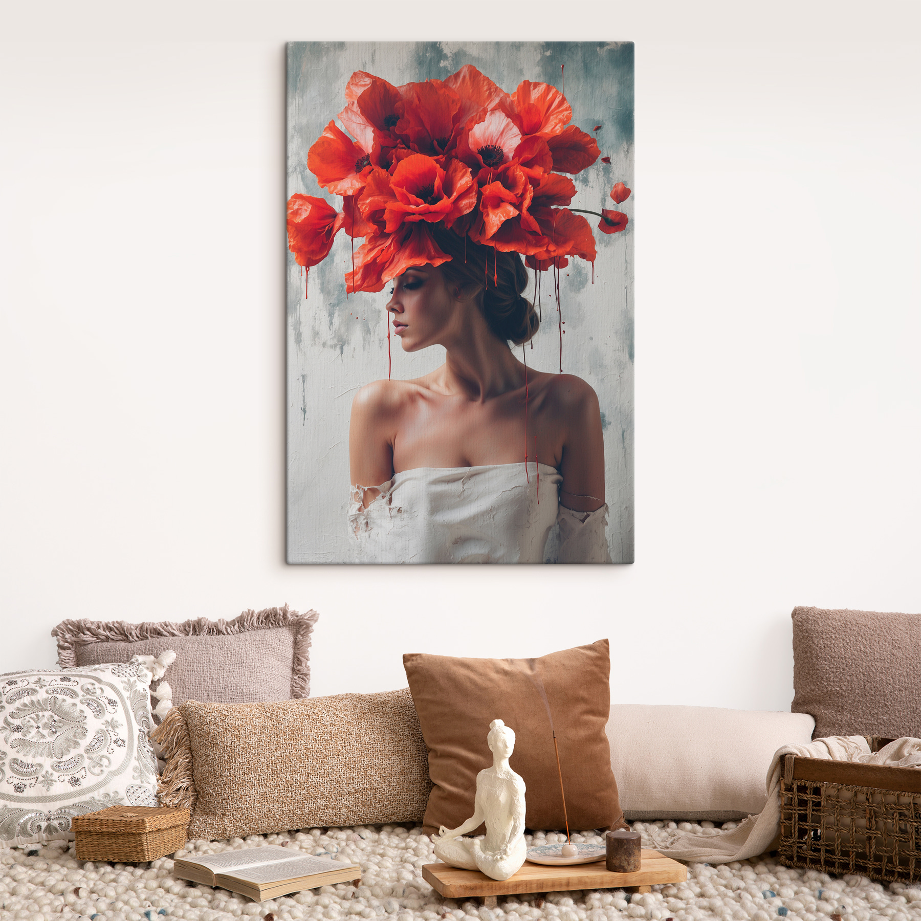 Imaginați-vă că intrați într-o cameră și sunteți întâmpinați de această pânză de artă uimitoare. O femeie împodobită cu flori roșii vibrante, radiind deopotrivă putere și grație. Aceste flori îndrăznețe necesită atenție, aproape ca și cum ar șopti secretele verii. Imaginați-vă cum ar putea stârni bucurie într-un colț de lectură confortabil sau cum ar adăuga un strop de culoare unui spațiu minimalist. Felul în care aceste roșii ies în evidență pe un fundal cu textură fină? Este ca și cum natura și măiestria artistică au făcut echipă pentru o conversație frumoasă. Această piesă nu este doar decor; este o stare de spirit, o poveste care așteaptă să se desfășoare. Și să fim sinceri – cine nu și-ar dori o piesă care se simte ca o îmbrățișare caldă într-o zi mohorâtă?