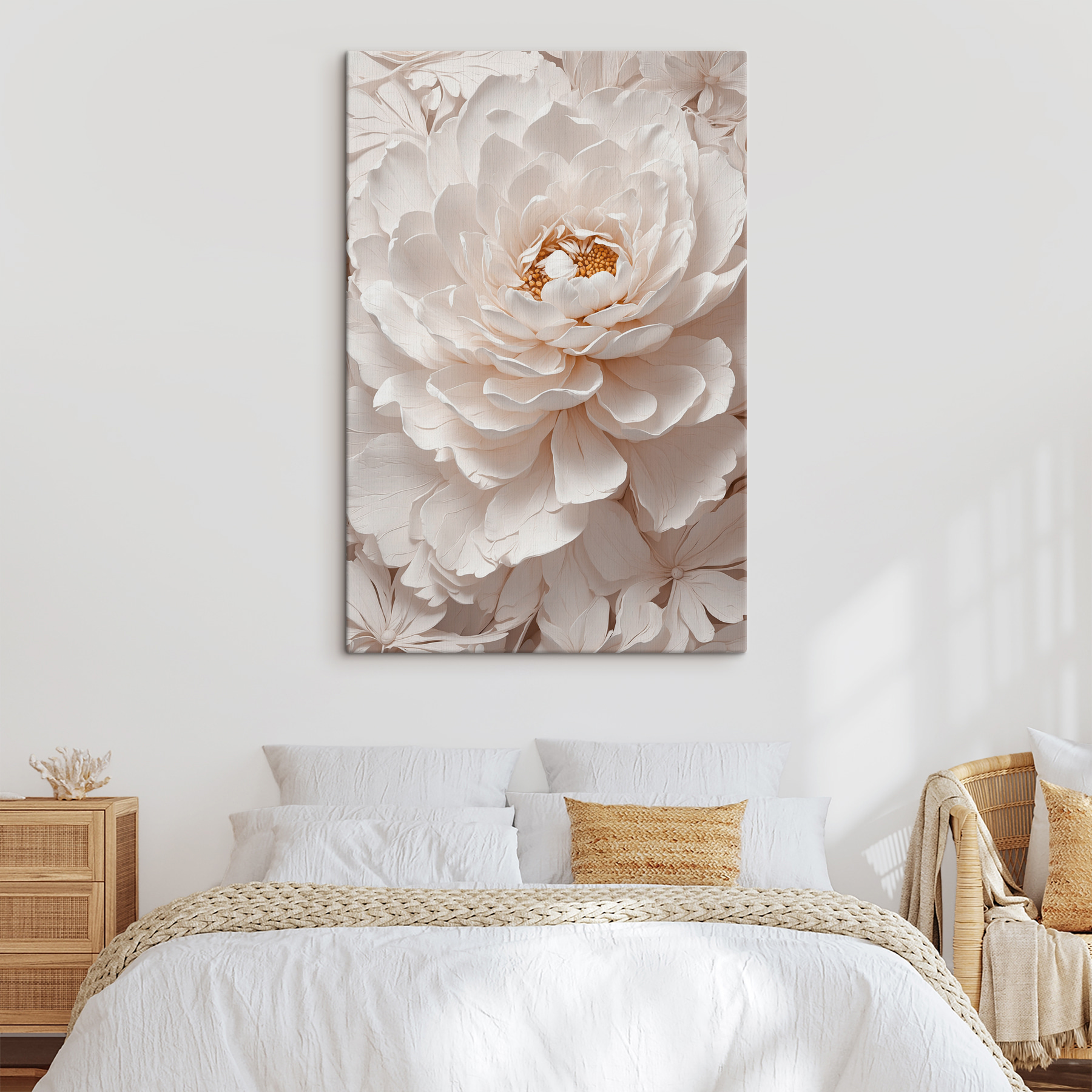 Ați intrat vreodată într-o cameră și v-ați simțit instantaneu în pace? Asta este ceea ce poate face această pânză de artă pentru spațiul tău. Denumită pe bună dreptate “Tablouri s40348”, este ca o floare uriașă înghețată în timp – subtilă, elegantă și atât de șic. Imaginați-vă această frumusețe în sufrageria sau dormitorul dvs., atrăgând priviri și complimente de la toți cei care intră. Petalele alb-crem, aproape palpabile, vă fac să vă simțiți ca într-o grădină de flori senină. Este un amestec perfect atât pentru iubitorii de artă, cât și pentru pasionații de flori. Vorbește despre “artă fină” fără pretenții și cu mult farmec. Această piesă nu este doar atârnată pe perete; șoptește calm și o notă de rafinament în viața ta de zi cu zi. Perfectă pentru cei care tânjesc după un pic din arta naturii în interior, fără polen!