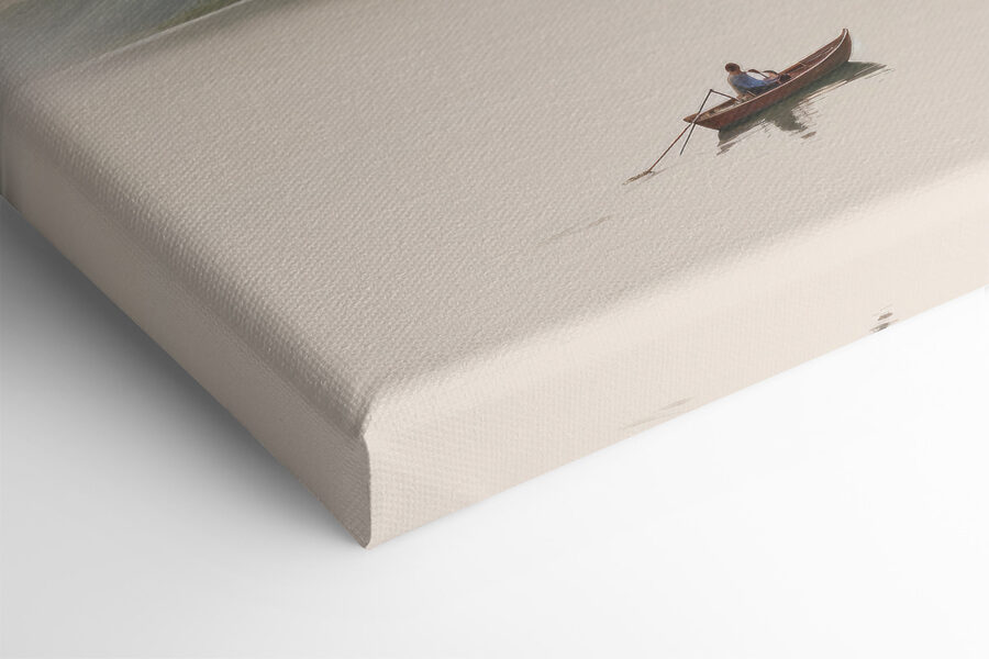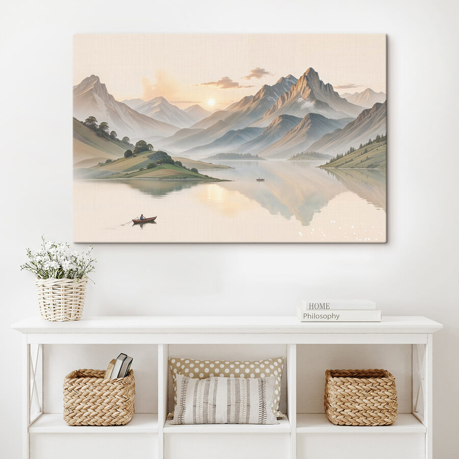 Transformați orice spațiu cu această imprimare uimitoare pe pânză cu un lac senin îmbrățișat de munți maiestuoși și o barcă liniștită care alunecă pe apă. Este ca o mini evadare în natură fără cizme de drumeție. Imaginați-vă că vă așezați în sufragerie, cu această operă de artă agățată pe perete, și simțiți cum vă cuprinde calmul după o zi lungă. Nuanțele suave se îmbină, invitând la amintiri de veri liniștite și brize blânde. Perfectă pentru a stârni conversații sau doar pentru a visa cu ochii deschiși în timp ce sorbiți cafea, este o piesă care șoptește povești despre aventură și liniște.