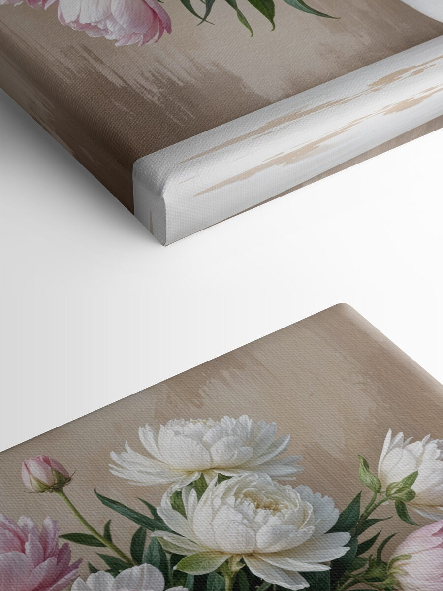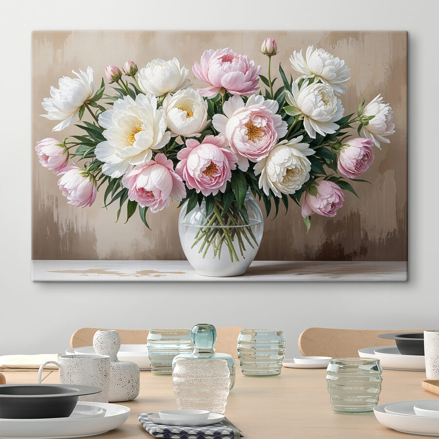 Înveselește-ți spațiul cu această încântătoare imprimare pe pânză, “Vază de flori pe o masă”. Este ca și cum ai aduce o bucată de primăvară în casă, fără a fi nevoie să o uzi! Imaginați-vă că intrați într-o cameră în care bujorii explodează de culoare – rozuri moi și alburi care joacă împreună ca niște prieteni vechi. Fundalul cald și primitor adaugă o notă confortabilă. Fie că este într-un living șic sau într-un dormitor senin, această piesă de artă stârnește bucurie și complimente din belșug. Perfectă pentru a visa cu ochii deschiși sau pentru a sta la curent cu o carte bună, este ca o mică îmbrățișare pentru ochi. Cine nu ar zâmbi la asta?