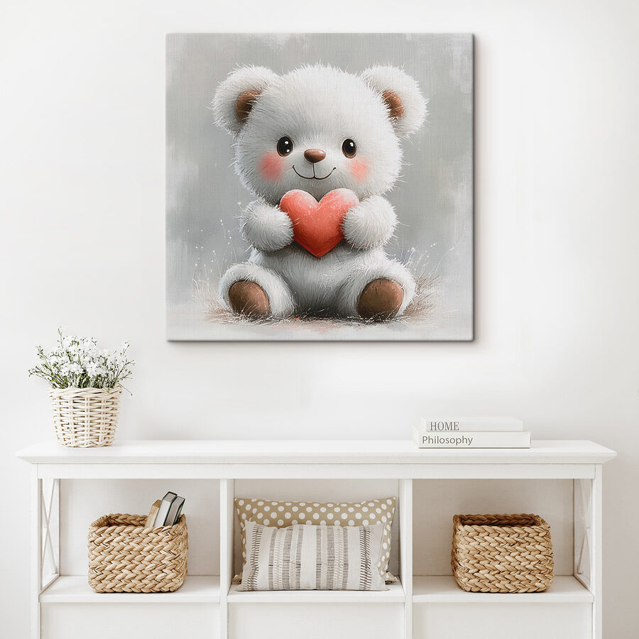 Înveseliți orice spațiu cu această încântătoare imprimare pe pânză cu un ursuleț alb pufos de pluș care strânge o inimă. Este ca și cum ai avea un mic pachet de bucurie agățat pe perete! Imaginează-ți că treci pe lângă el și îi vezi chipul drăgălaș – este o îmbunătățire instantanee a dispoziției. Fie că este vorba de o cameră de copil, de un living confortabil sau chiar de biroul tău (pentru că cine nu are nevoie de puțină drăgălășenie la serviciu?), această operă de artă adaugă căldură și un strop de farmec. În plus, șoptește povești despre confortul copilăriei și bucuriile simple. Așadar, de ce să nu inviți această creatură drăgălașă în casa ta? Cu siguranță va aduce zâmbete și poate chiar va inspira câteva momente emoționante!