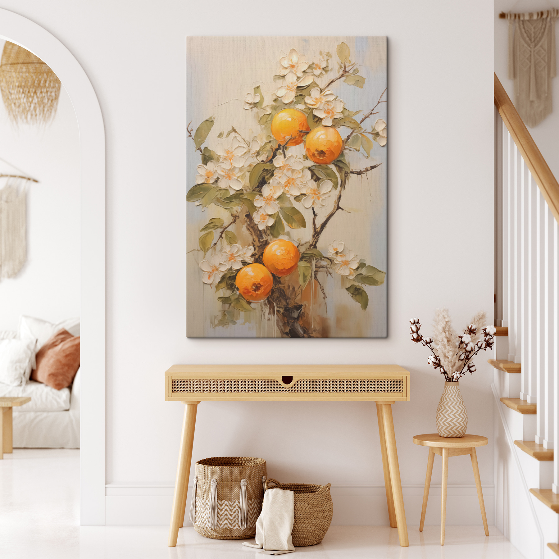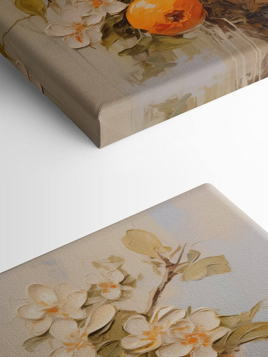 Înveseliți orice spațiu cu această imprimare încântătoare pe pânză cu portocale fermecătoare cuibărită printre flori delicate. Este ca și cum ai aduce o felie de viață însorită din livadă în casă. Imaginați-vă-o agățată într-o bucătărie confortabilă sau într-o sufragerie veselă – cu siguranță va stârni conversații. Portocalele vibrante ies în evidență față de nuanțele moi, creând un punct focal răcoritor. Imaginați-vă sorbind cafeaua dimineața în timp ce vă bucurați de strălucirea ei caldă. Nu este doar artă; este starea de spirit de care toată lumea are nevoie. Tot ce lipsește este o aromă dulce de citrice! Această piesă este perfectă pentru oricine apreciază frumusețea naturii într-un mod unic.