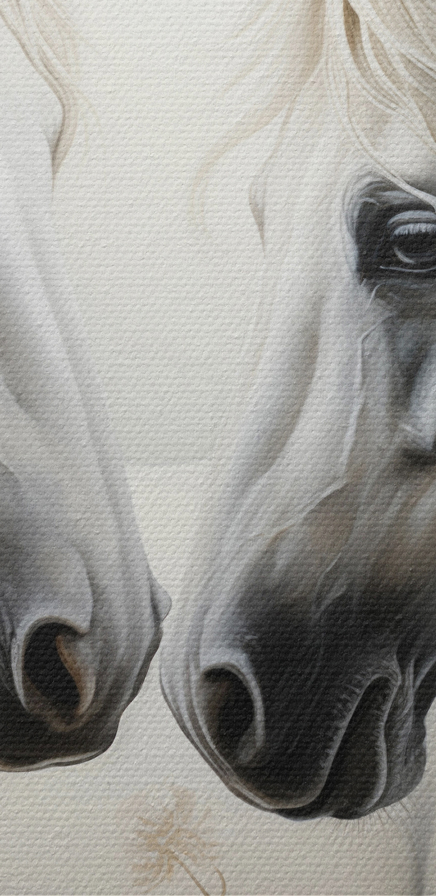 Imaginați-vă că intrați într-o cameră și sunteți întâmpinați de doi cai magnifici, cu coamele lor curgătoare aproape dansând în briza ușoară. Această imprimare pe pânză, care prezintă aceste creaturi uimitoare, adaugă un aer de liniște oricărui spațiu. Imaginați-vă-o deasupra unui șemineu confortabil sau într-un dormitor senin, invitându-i pe cei care o văd să se oprească, să respire și să aprecieze frumusețea naturii. Culorile moi și detaliile delicate vă fac să vă simțiți ca și cum ați păși într-un vis. Fie că sunteți un iubitor de animale sau doar cineva care apreciază arta care liniștește sufletul, această piesă va stârni cu siguranță conversații și va aduce zâmbete. Cine nu și-ar dori o bucată de seninătate atârnată pe perete?