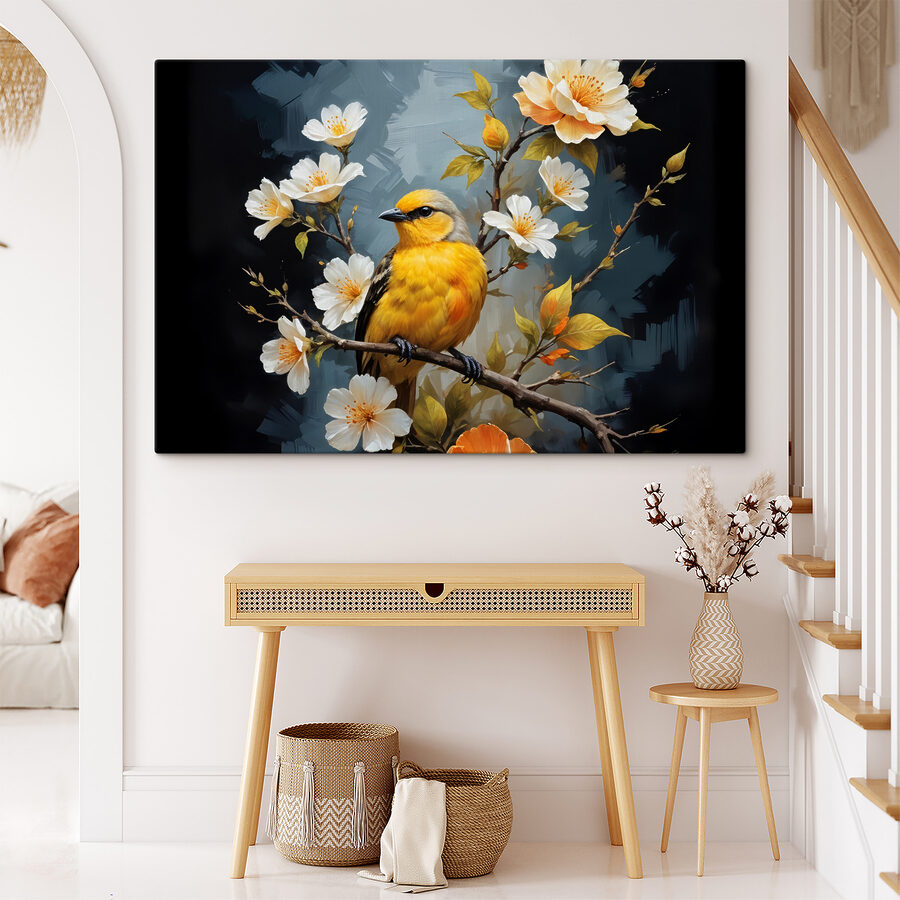 Înveseliți orice perete cu această pânză încântătoare cu o pasăre încântătoare cocoțată pe o ramură împodobită cu flori înflorite. Este ca o bucățică de natură chiar în casa ta, care te roagă să stârnești bucurie. Imaginați-vă că intrați într-o cameră cu această piesă și vă simțiți imediat mai liniștiți, ca și cum o briză blândă de primăvară tocmai a pătruns. Galbenul vibrant va atrage cu siguranță privirile, în timp ce petalele moi adaugă acea notă perfectă de fantezie. Fie că este pentru un colțișor confortabil sau pentru un perete, această operă de artă aduce căldură, farmec și un pic de aer liber în viața de zi cu zi. Perfectă pentru cei care iubesc un amestec de eleganță și un pic de distracție!
