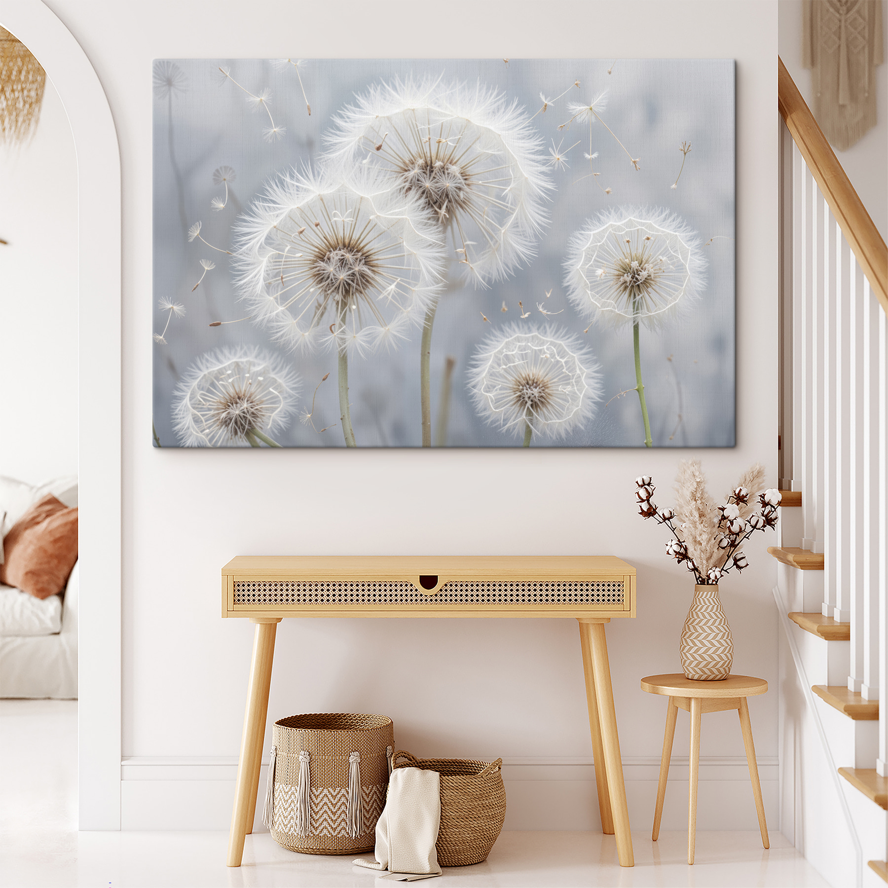 Transformați orice spațiu cu această imprimare încântătoare pe pânză cu un grup de păpădii, semințele lor delicate plutind ca niște vise mici în adierea vântului. Este ca și cum ați captura un moment din capriciul naturii – imaginați-vă că vă teleportați pe o pajiște însorită de fiecare dată când vă plimbați pe acolo. Perfectă pentru o cameră de zi sau un colțișor confortabil, această piesă aduce o notă suavă de liniște. Prietenii s-ar putea uita de două ori, întrebându-se dacă primăvara este chiar după colț. Este o reamintire blândă a faptului că frumusețea există în micile detalii ale vieții, și cine nu își dorește acest vibe acasă?