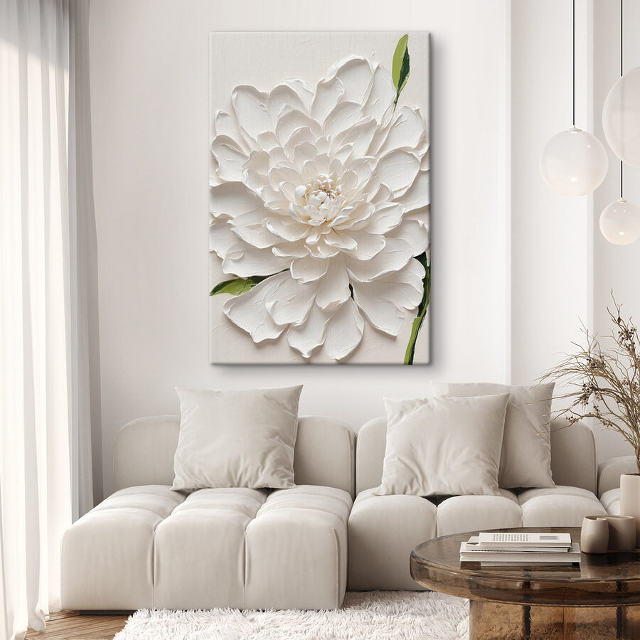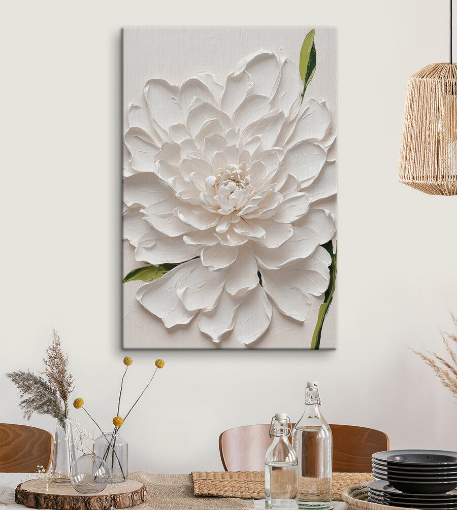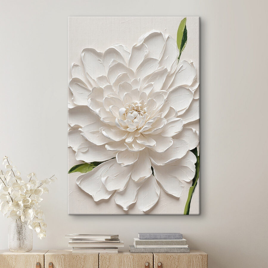 Înveseliți orice spațiu cu această fermecătoare imprimare pe pânză, “Tablouri Elegant White Blossom in Relief”. Imaginați-vă că intrați într-o cameră și sunteți întâmpinați de această floare supradimensionată – este ca o îmbrățișare caldă! Albul moale și verdele blând o fac perfectă pentru a crea o atmosferă primitoare. Nu este doar artă; este și un stimulent al dispoziției. Imaginați-vă pe cineva sorbind o cafea în apropiere, aruncând priviri la această floare minunată în timp ce visează la primăvară. Fie că este vorba despre camera de zi, dormitor sau chiar un colț de lectură confortabil, această piesă îmbină fără efort eleganța și o notă de natură. Un accesoriu încântător care stârnește conversații și zâmbete.