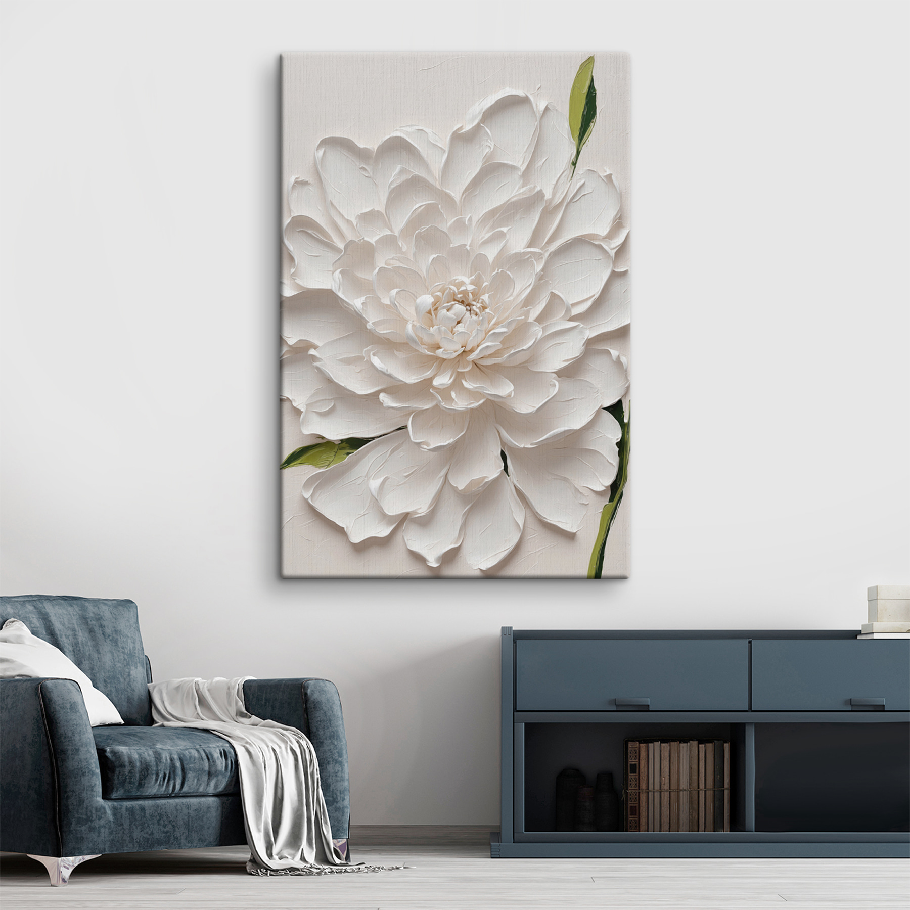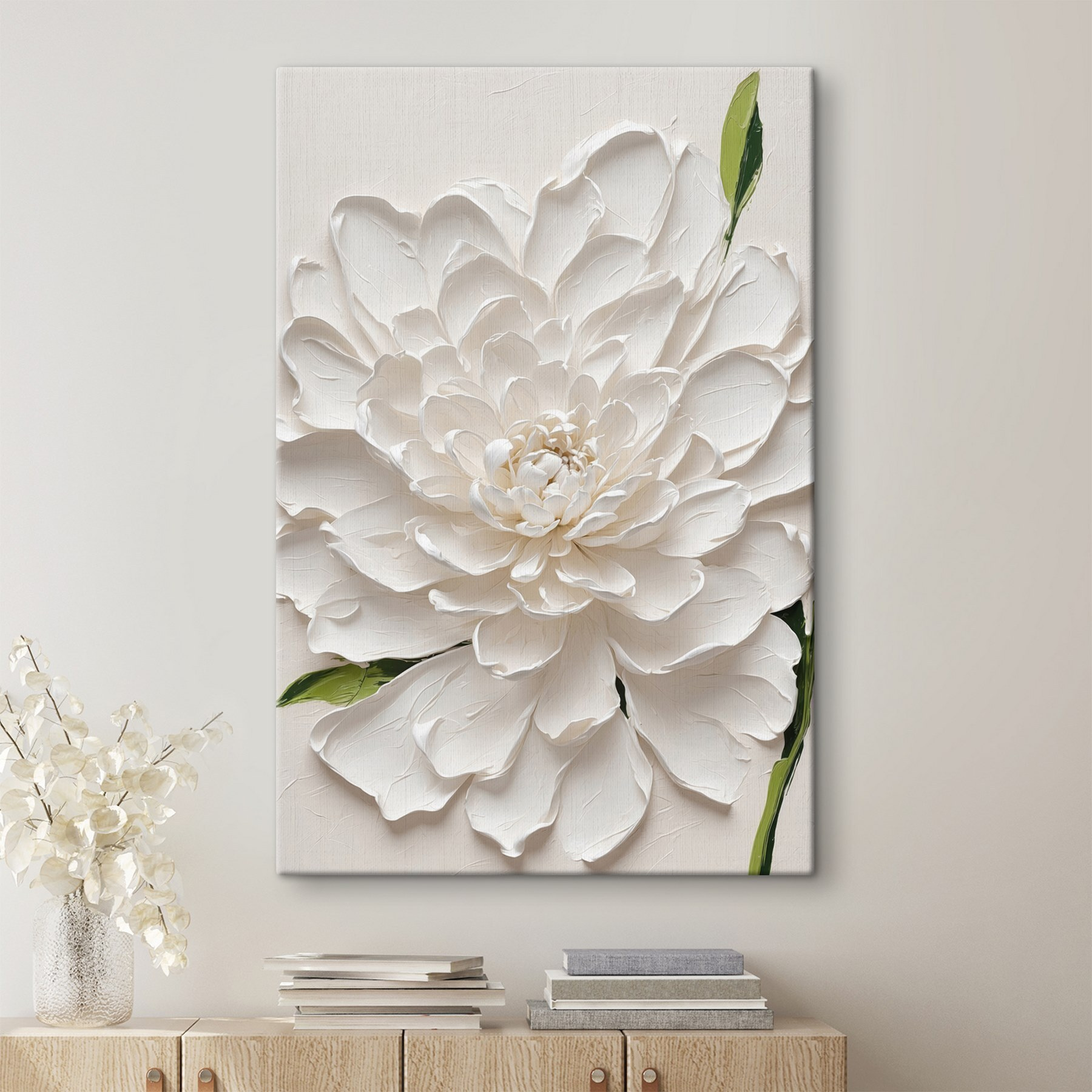 Înveseliți orice spațiu cu această fermecătoare imprimare pe pânză, “Tablouri Elegant White Blossom in Relief”. Imaginați-vă că intrați într-o cameră și sunteți întâmpinați de această floare supradimensionată – este ca o îmbrățișare caldă! Albul moale și verdele blând o fac perfectă pentru a crea o atmosferă primitoare. Nu este doar artă; este și un stimulent al dispoziției. Imaginați-vă pe cineva sorbind o cafea în apropiere, aruncând priviri la această floare minunată în timp ce visează la primăvară. Fie că este vorba despre camera de zi, dormitor sau chiar un colț de lectură confortabil, această piesă îmbină fără efort eleganța și o notă de natură. Un accesoriu încântător care stârnește conversații și zâmbete.