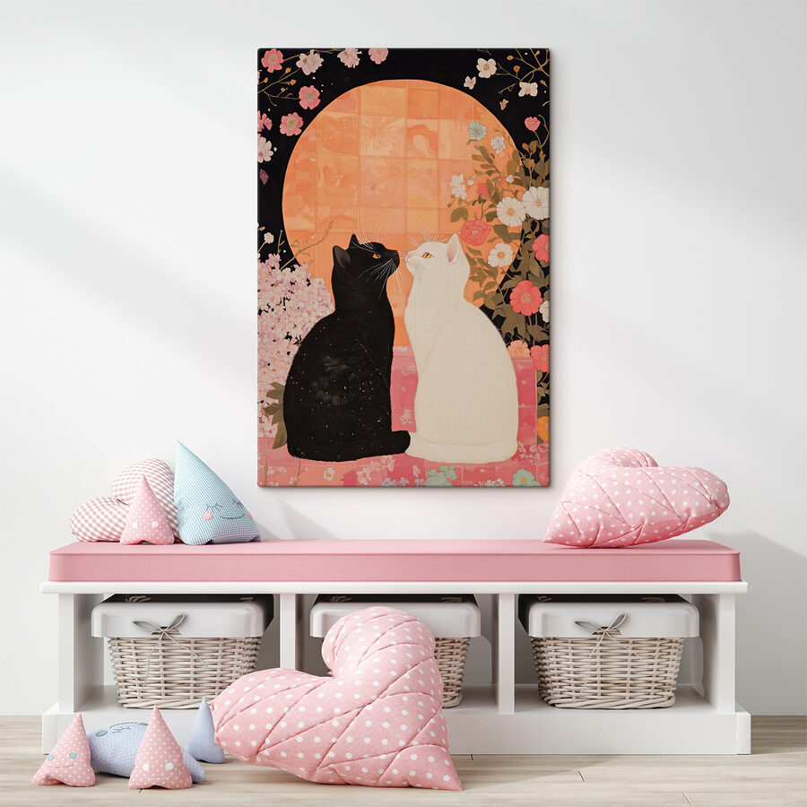 Aduceți o notă de fantezie spațiului dvs. cu pânza “Pisici albe și negre care se privesc una pe cealaltă”. Imaginați-vă acest lucru: două pisici, la fel de diferite ca ziua și noaptea, dar care împărtășesc o legătură nespusă sub o strălucire moale și caldă. Este ca și cum ar schimba secrete ale universului – sau ar plănui un salt jucăuș. Această piesă îmbină farmecul companiei animalelor cu detalii florale delicate, fiind perfectă pentru cei care iubesc un amestec de natură și curiozitate. Imaginați-vă-o în camera dvs. de zi, adăugând un strop de finețe felină. Este mai mult decât artă – este un starter de conversație!