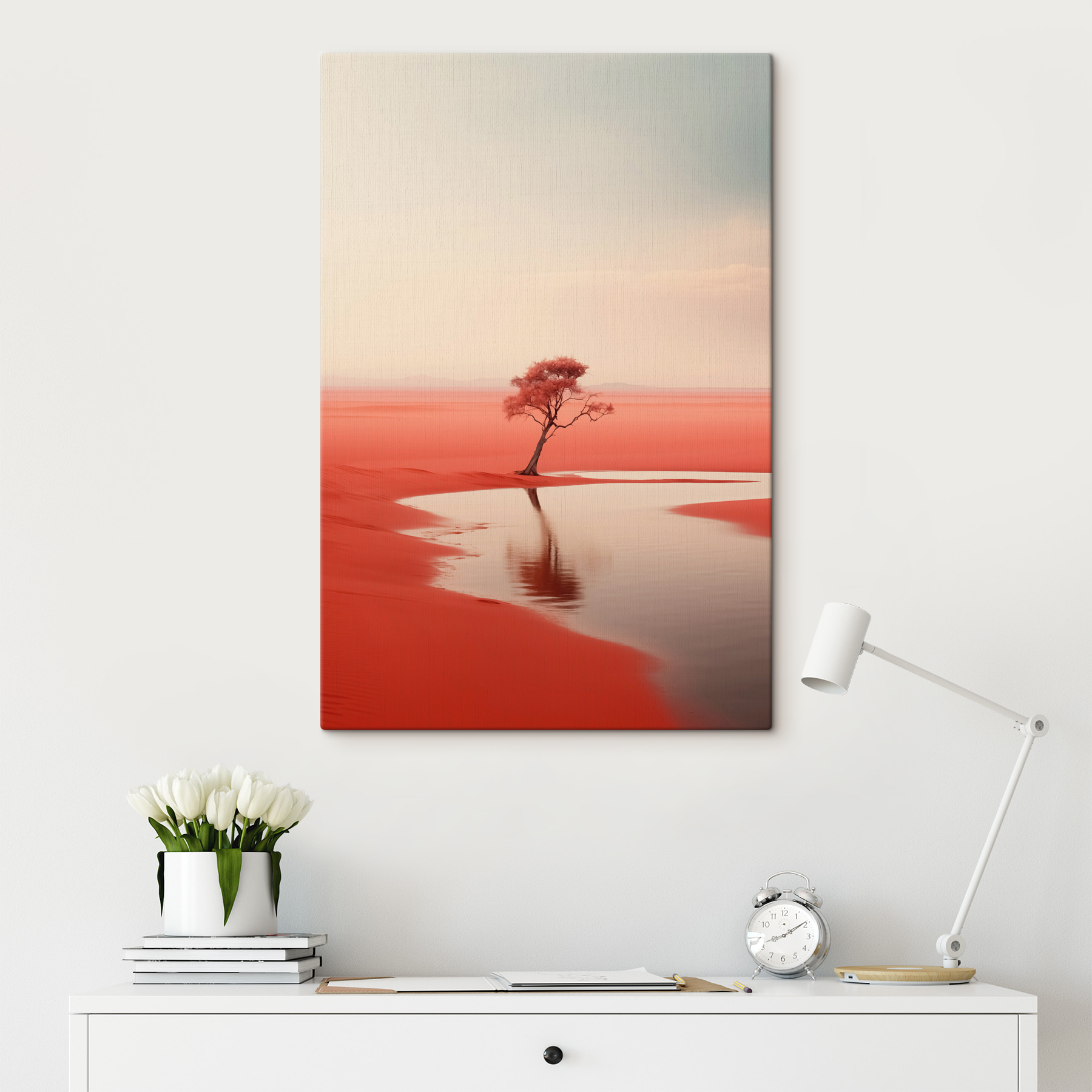 Imaginați-vă un vast deșert roșu, unde un copac singuratic stă ca un prieten ciudat pe un fundal uluitor. Această imprimare pe pânză, “Copac într-un deșert roșu”, surprinde esența singurătății și a frumuseții, perfectă pentru oricine dorește să adauge o notă izbitoare spațiului său. Culorile bogate ies în evidență, aproape șoptind povești de aventură și liniște. Imaginați-vă intrând într-o cameră și fiind instantaneu transportat în acest peisaj senin, unde grijile dispar. Nu este doar un decor; este un memento zilnic pentru a sta drept și a îmbrățișa unicitatea. O mică felie din arta naturii care va stârni conversații și poate chiar vise cu ochii deschiși.