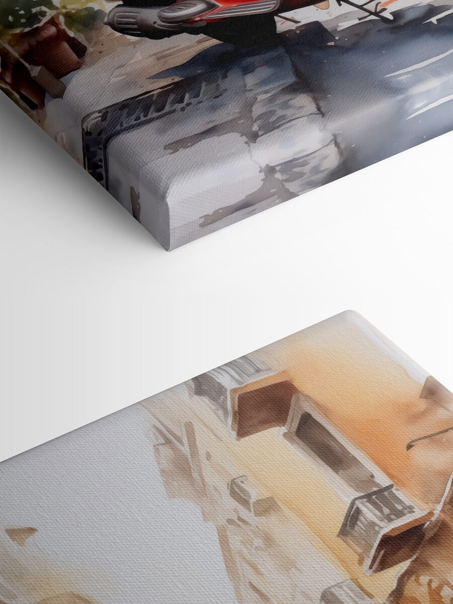 Imaginați-vă că vă plimbați pe o stradă însorită dintr-un fermecător oraș european și, bam! Vedeți acel strop de roșu – un scuter parcat exact așa. Această pânză acuarelă surprinde acel moment perfect. Are toate acele vibrații, îmbinând o notă de aventură cu un strop de nostalgie. Agățați-o în sufragerie și, dintr-o dată, spațiul dvs. are un bilet gratuit către hoinăreală. Prietenii s-ar putea să treacă pe aici, să arunce o privire la el și să viseze cu ochii deschiși la plimbări pe străduțe pietruite. Nu este doar artă; este o stare de spirit pe peretele tău.