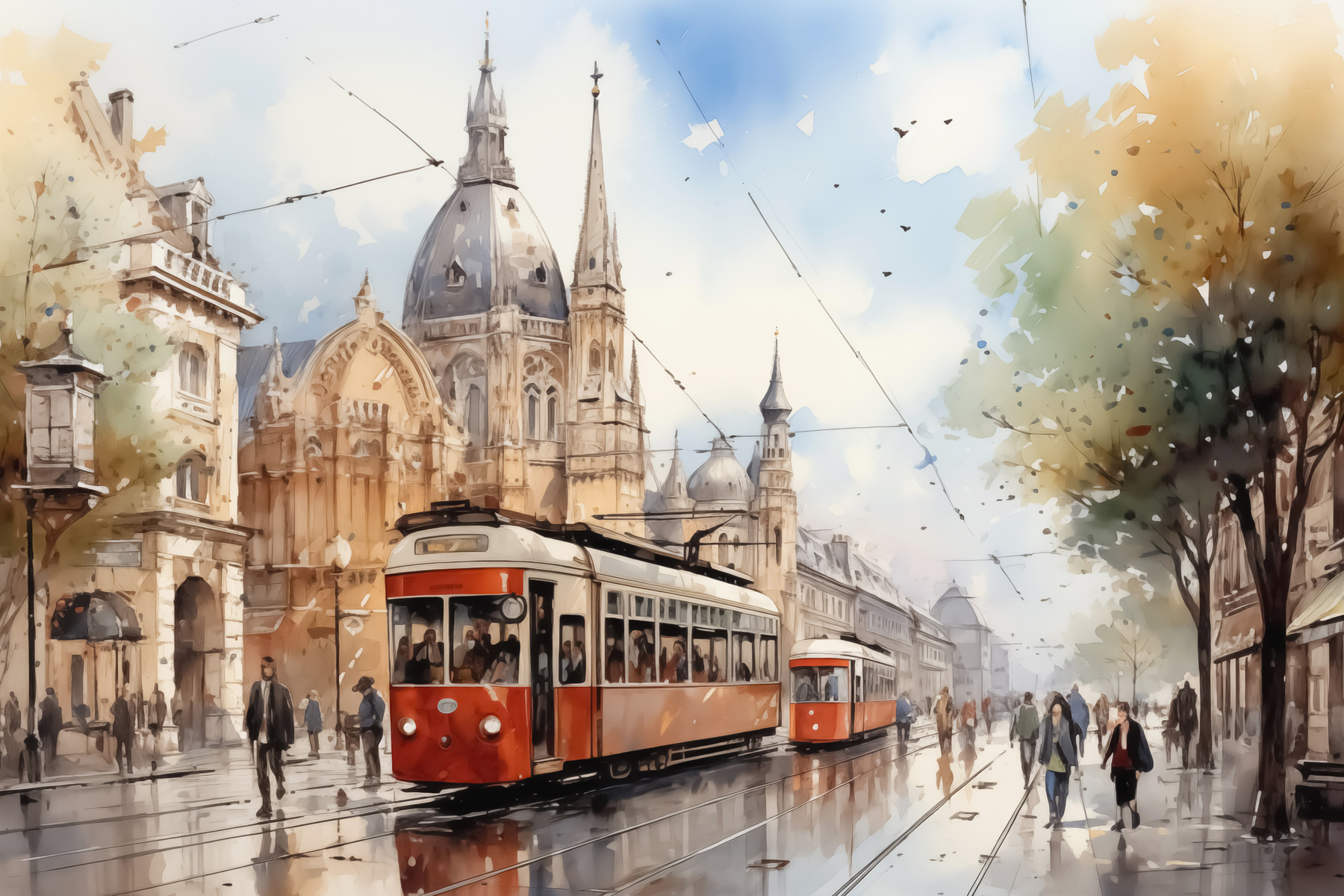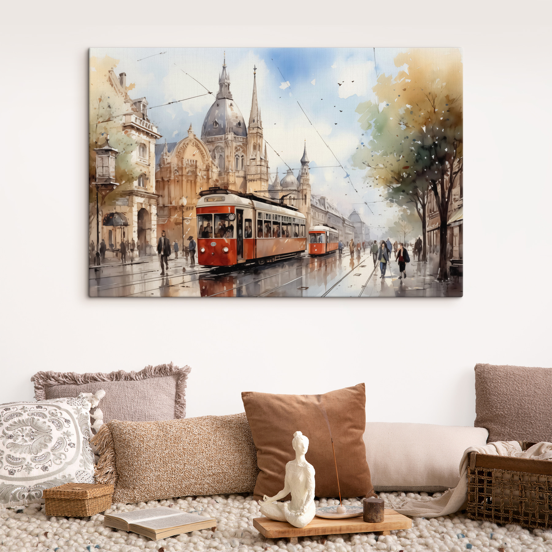 Intrați în farmecul străzilor pline de viață cu imprimarea pe pânză “Trolley on a Street”. Este ca un vis în acuarelă care prinde viață, îmbinând eleganța arhitecturii lumii vechi cu vibrația cotidiană a vieții de oraș. Știi tu, genul de scenă care te face să visezi cu ochii deschiși la o cafea la o cafenea mică în timp ce privești lumea trecând. Această piesă ar putea aduce un strop de nostalgie în orice colț, stârnind curiozitate și șoapte despre povești de călătorie. Perfectă pentru oricine are o slăbiciune pentru aventurile urbane și flerul artistic!
