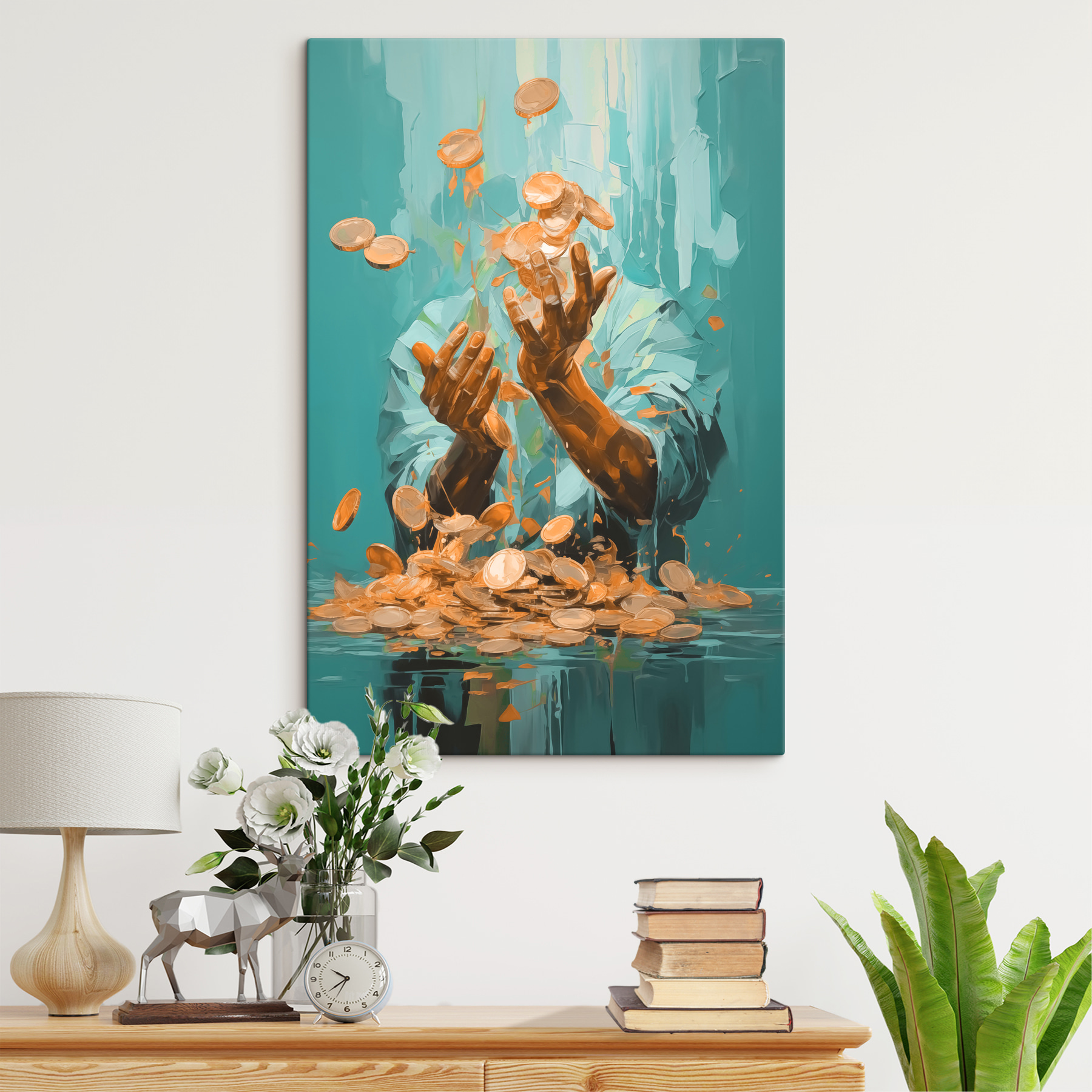 Imaginați-vă un moment înghețat în timp, în care monedele par să danseze în aer, iar toate grijile dispar. Acest print pe pânză surprinde acest spectacol încântător, cu mâini care aruncă cu artă monede care prind lumina – o clipă de bucurie și fantezie. Fie că este agățat într-o sufragerie confortabilă sau într-un birou plin de viață, acesta adaugă o explozie de energie și un strop de intrigă. Imaginați-vă că stârnește conversații, pe măsură ce oaspeții se întreabă ce vise se ascund în spatele acestui gest jucăuș. Este mai mult decât artă; este un memento pentru a îmbrățișa spontaneitatea și a găsi bucurie în lucrurile mărunte. Perfect pentru toți cei care cred în magia posibilităților.
