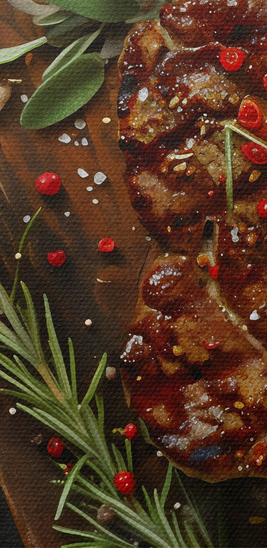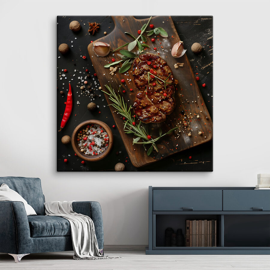 Imaginați-vă acest lucru: confortul bucătăriei dvs. întâlnește flerul artistic al unei galerii. Această imprimare pe pânză, care prezintă o bucată suculentă de carne decorată cu mirodenii și ierburi, aduce un strop de aventură culinară pe pereții dvs. Este ca și cum ai avea planșa unui maestru bucătar capturată în mijlocul creației – se aude aproape șuieratul! Perfect pentru gurmanzi sau pentru oricine iubește o notă de farmec rustic. Agățați-o și s-ar putea să vă inspire următorul experiment gastronomic – sau cel puțin să vă facă poftă de o cină copioasă cu friptură. Decor delicios, cineva?