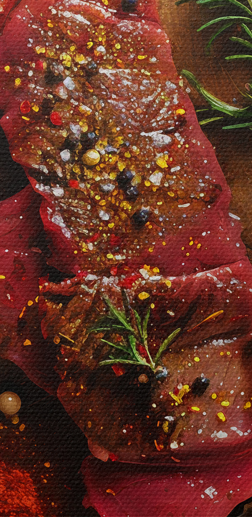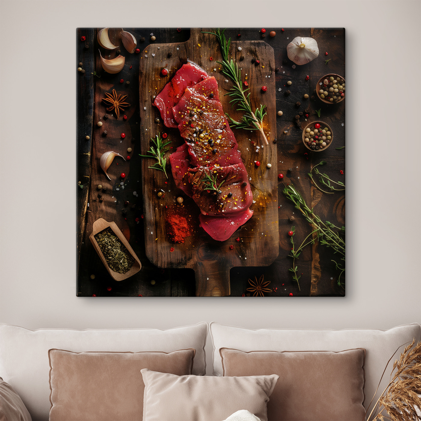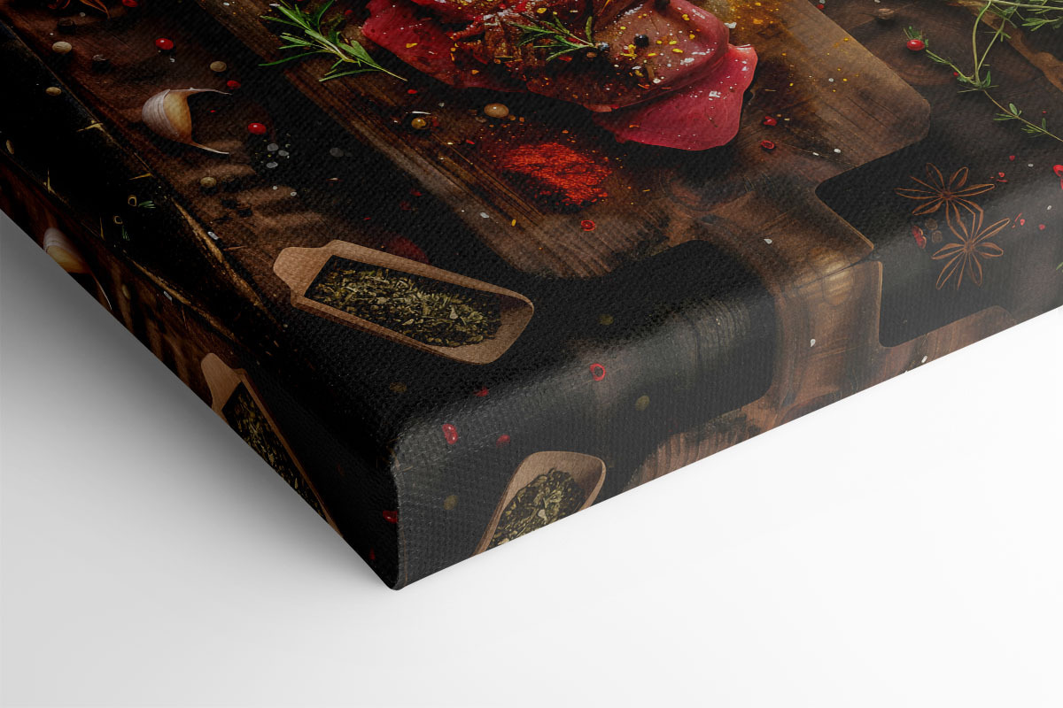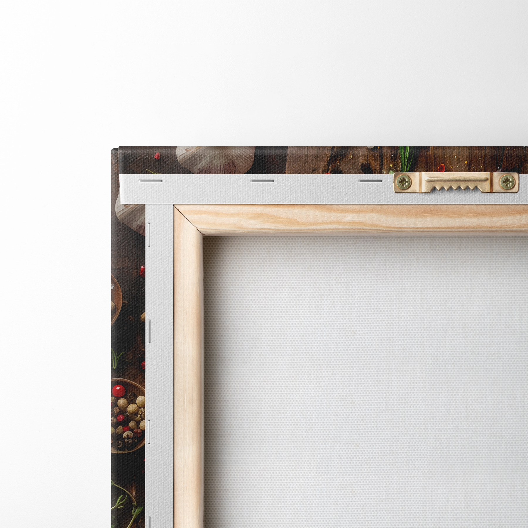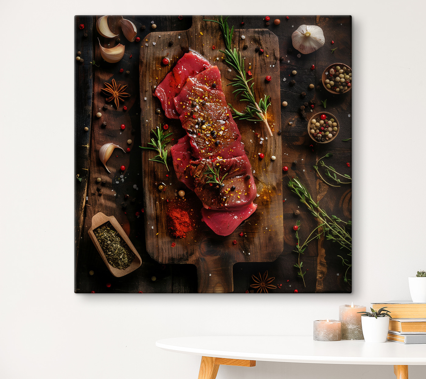 V-ați imaginat vreodată bucătăria ca pe o galerie de capodopere? Aruncați o privire la această imprimare intrigantă pe pânză – “Carne pe o placă de tăiat cu condimente și ierburi”. Este de-a dreptul apetisantă, emană căldură și confort. Genul de lucru care te face să poftești la o tocană consistentă într-o zi ploioasă. Perfect pentru gurmanzi sau pentru oricine dorește o atmosferă rustică. Condimentele parcă îți șoptesc rețete secrete. Agață-l și privește cum se transformă spațiul tău. Atenție: Poate provoca chefuri spontane de gătit sau stări de foame la ore ciudate!