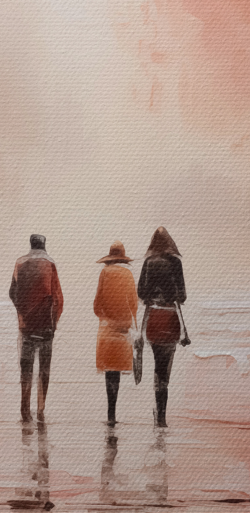 Imaginați-vă asta: o plimbare într-o zi ploioasă transformată într-o operă de artă. “Tablouri Group of People Walking on a Wet Street” surprinde esența acelor momente senine, de reflecție, când o ploaie ușoară trezește orașul. Această piesă aduce un aer confortabil în orice cameră, cu culorile sale blânde și modul în care figurile se amestecă elegant în magia acuarelei. Perfectă pentru a condimenta acel perete gol la care vă holbați. Gândiți-vă la ea ca la o evadare vizuală – fără a fi nevoie să găsiți o umbrelă!