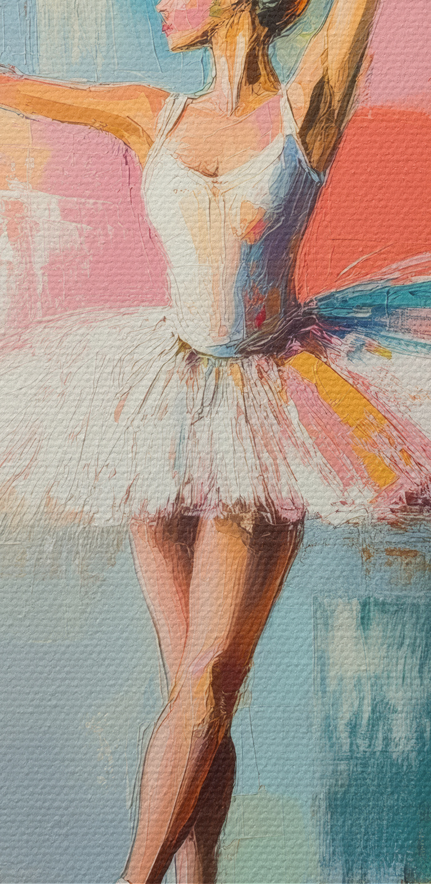 Dansând în camera ta de zi, acest print pe pânză surprinde o balerină care pare să sară direct de pe perete. Imaginați-vă stropii de culori – pasteluri moi care se amestecă de parcă au fost la cea mai tare petrecere. Tutu-ul ei se învârte cu grația unei brize de primăvară! Este un pic abstract, un pic de artă plastică și multă eleganță. Imaginează-ți cum îți sorbi cafeaua de dimineață sau cum te relaxezi după o zi lungă, iar această scenă vibrantă îți amintește să dansezi puțin în viața ta. Perfect pentru cei care apreciază o notă de fantezie în arta lor!