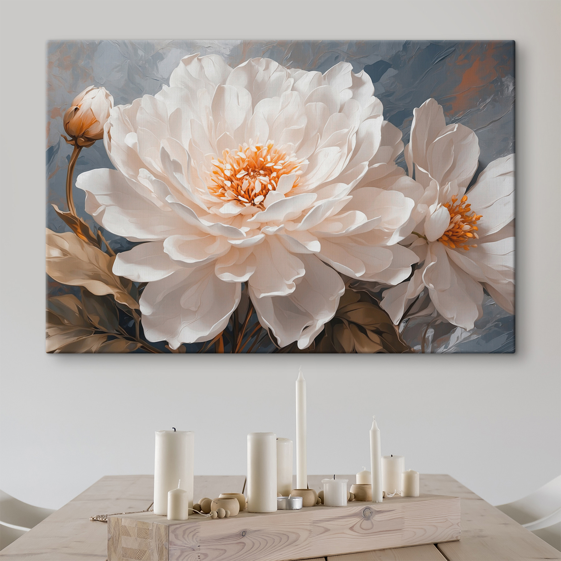 “Blooms in Serene White Hues” este ca o gură de aer proaspăt, aruncând o privire într-o grădină senină într-o dimineață de duminică fericită. Imaginați-vă aceste flori albe delicate care adaugă o notă de eleganță calmă sufrageriei dvs. sau chiar acel colț de lectură confortabil pe care l-ați aranjat. Nu este doar artă; este o evadare liniștită. Albul moale dansează ușor pe un fundal discret – un contrast încântător care șoptește rafinament și farmec. Prietenii ar putea crede că ți-ai dezvoltat brusc degetul verde! Perfect pentru relaxare și visare cu ochii deschiși.