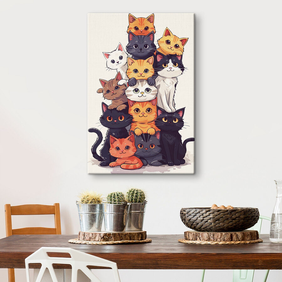 Imaginați-vă un colț confortabil al casei dvs. plin de fericire toarce. Această imprimare pe pânză, care prezintă o grămadă încântătoare de pisici jucăușe, aduce la viață acel sentiment cald și pufos. Fiecare pisicuță, cu acei ochi mari adorabili și expresii obraznice, pare să șoptească povești despre pozne și îmbrățișări. Plasarea acestei lucrări de artă pe perete transformă orice spațiu într-un fermecător tărâm al minunilor felin. Este ca și cum ai avea o grămadă de prieteni blănoși care veghează asupra ta, amintind tuturor că bucuria și prostia sunt doar la o privire distanță. Perfect pentru iubitorii de pisici sau pentru oricine are nevoie de o atmosferă veselă!