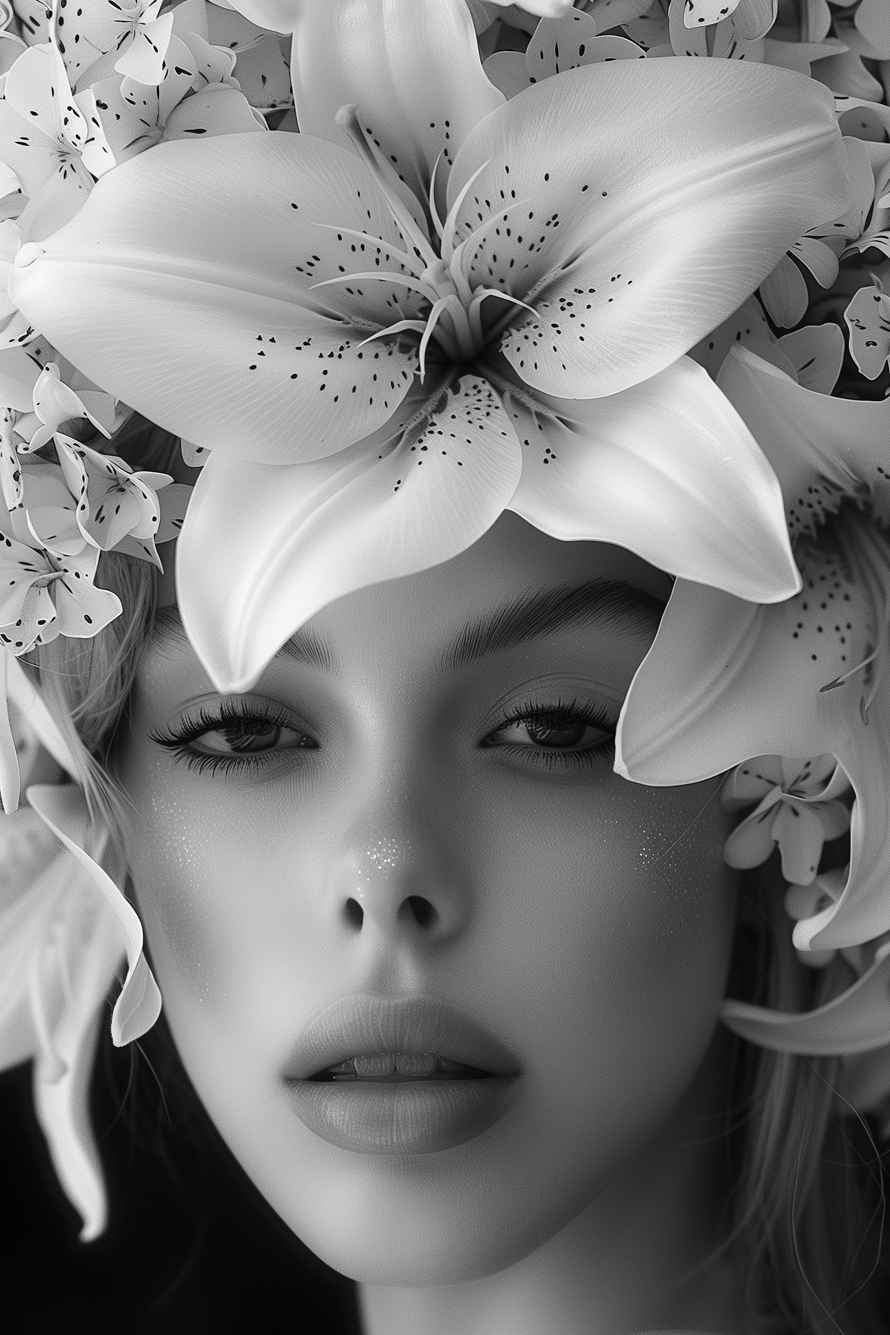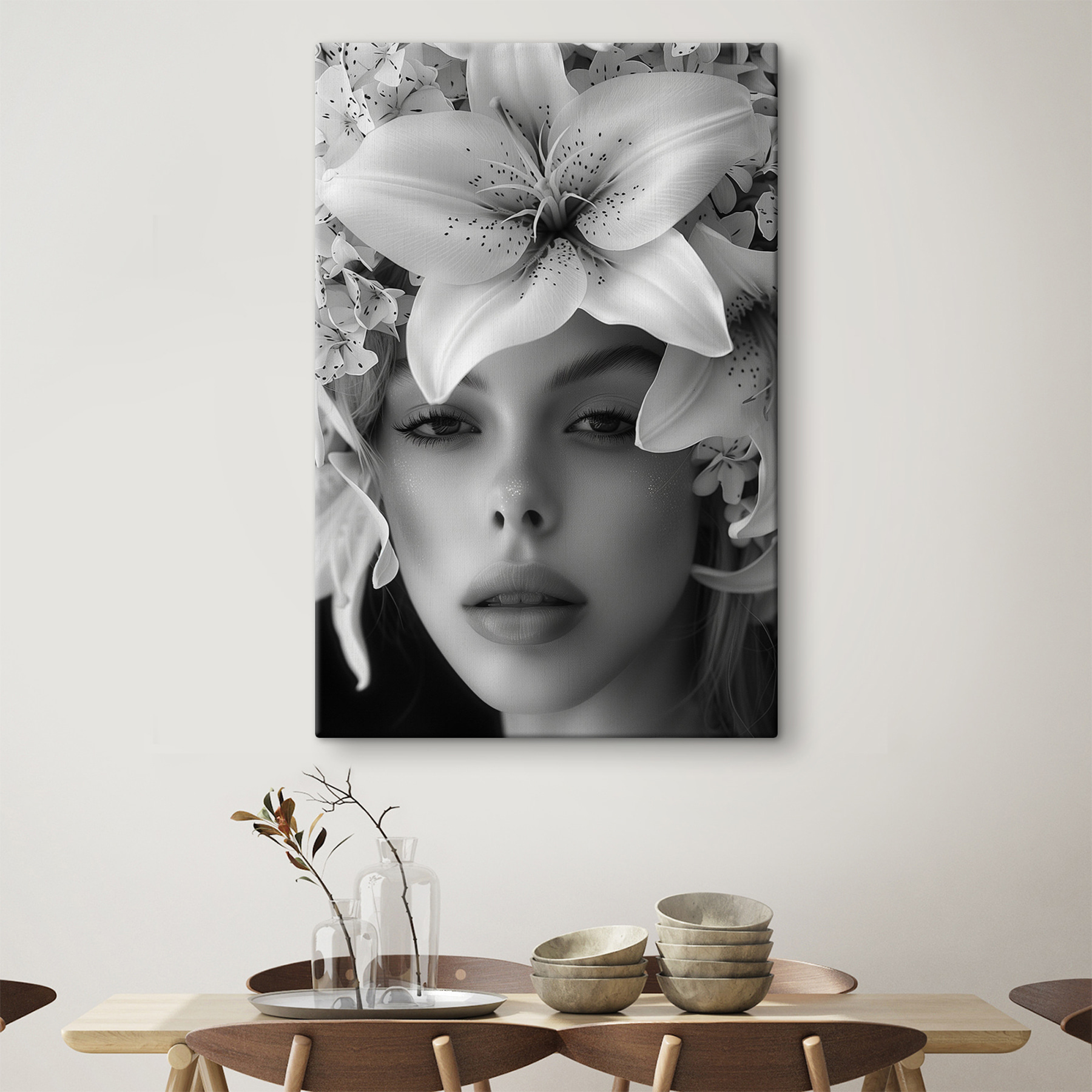 Imaginați-vă că intrați într-o cameră și sunteți întâmpinați de o pânză uimitoare – “Femeie cu flori pe cap”. Nu este doar artă; este un starter de conversație. Paleta alb-negru adaugă o notă de eleganță, în timp ce coroana ei florală aduce o notă de fantezie. Imaginați-vă asta: prieteni la o cafea, toți admirând și discutând despre expresia ei senină și despre florile uimitoare. Este ca și cum ai avea un pic de magie de grădină în interior! Perfectă pentru iubitorii de flori și pentru toți cei care apreciază frumusețea cu o notă de intrigă. Pereții dvs. vă vor mulțumi.