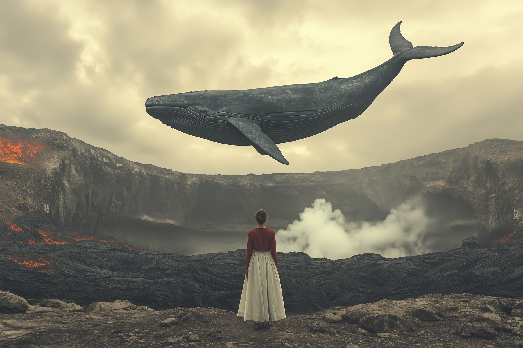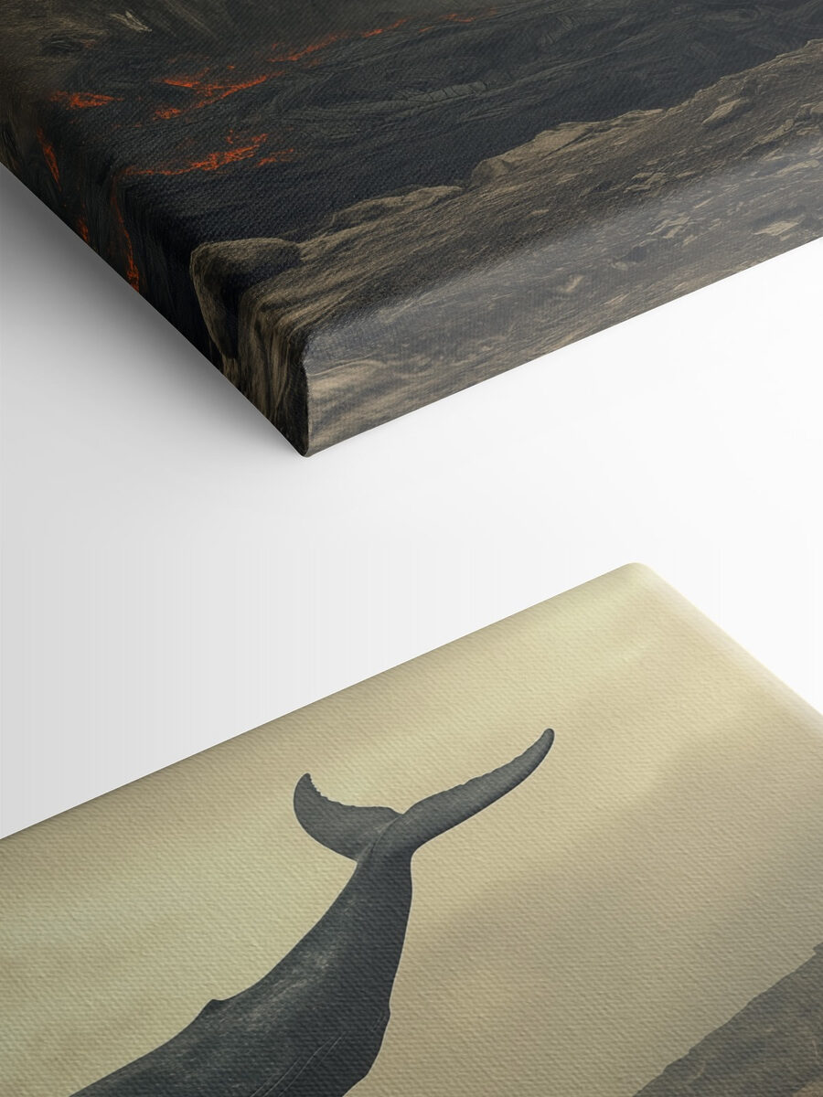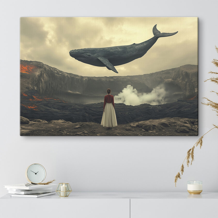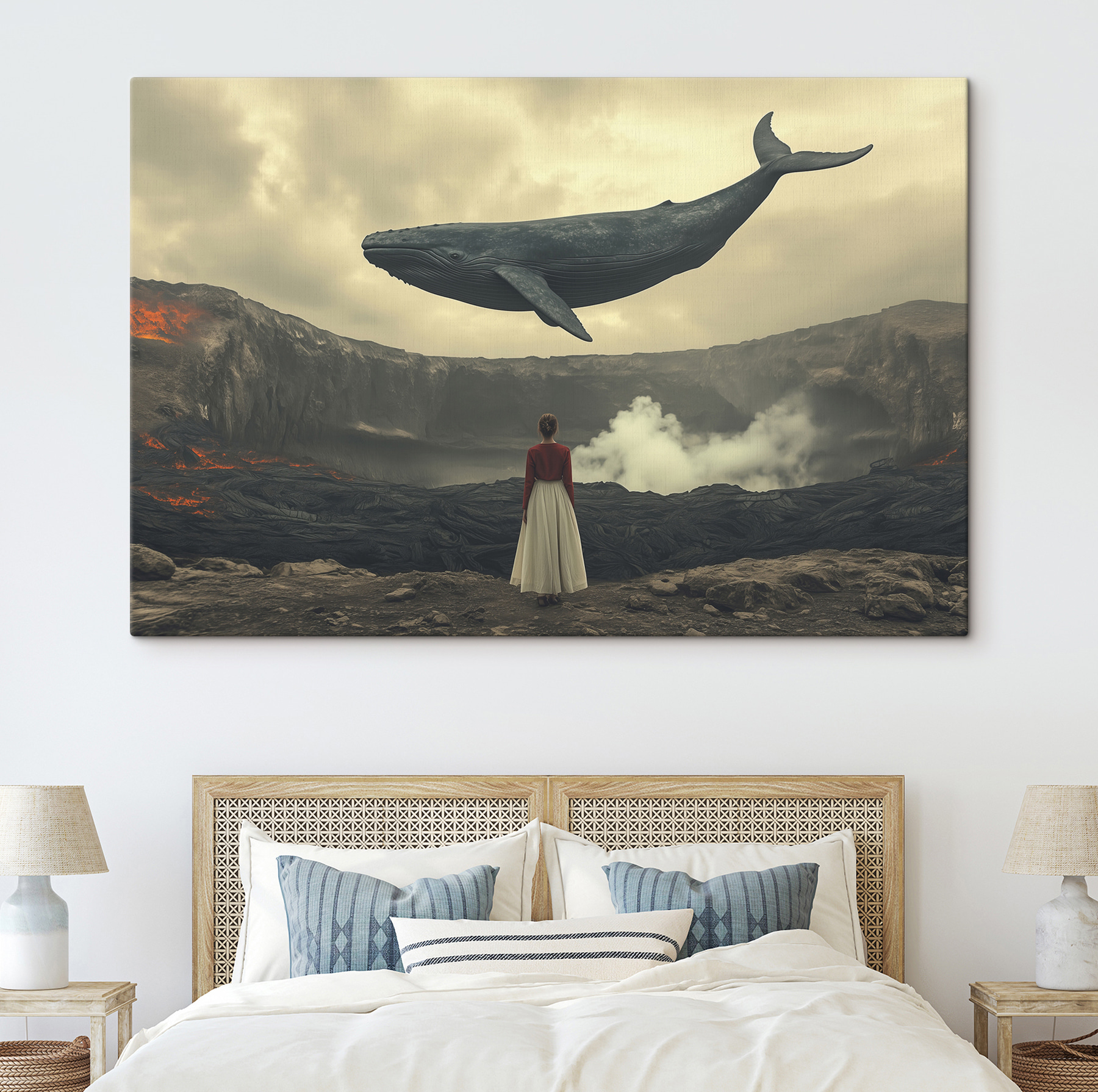 Scufundați-vă într-o lume a minunilor cu acest print pe pânză, în care o femeie senină privește o balenă masivă care zboară deasupra unui vulcan. Nu vezi în fiecare zi o balenă care face o plimbare pe deasupra lavei – asta da priveliște de visare cu ochii deschiși! Această piesă adaugă instantaneu dramatism și o notă de fantezie oricărui perete. Imaginați-vă-o înviorând un living sau inspirând conversații într-un colț confortabil. Culorile calde și scena intrigantă invită la curiozitate și admirație, făcând-o perfectă pentru oricine apreciază frumusețea și misterul naturii. Un adevărat showtopper, nu-i așa?