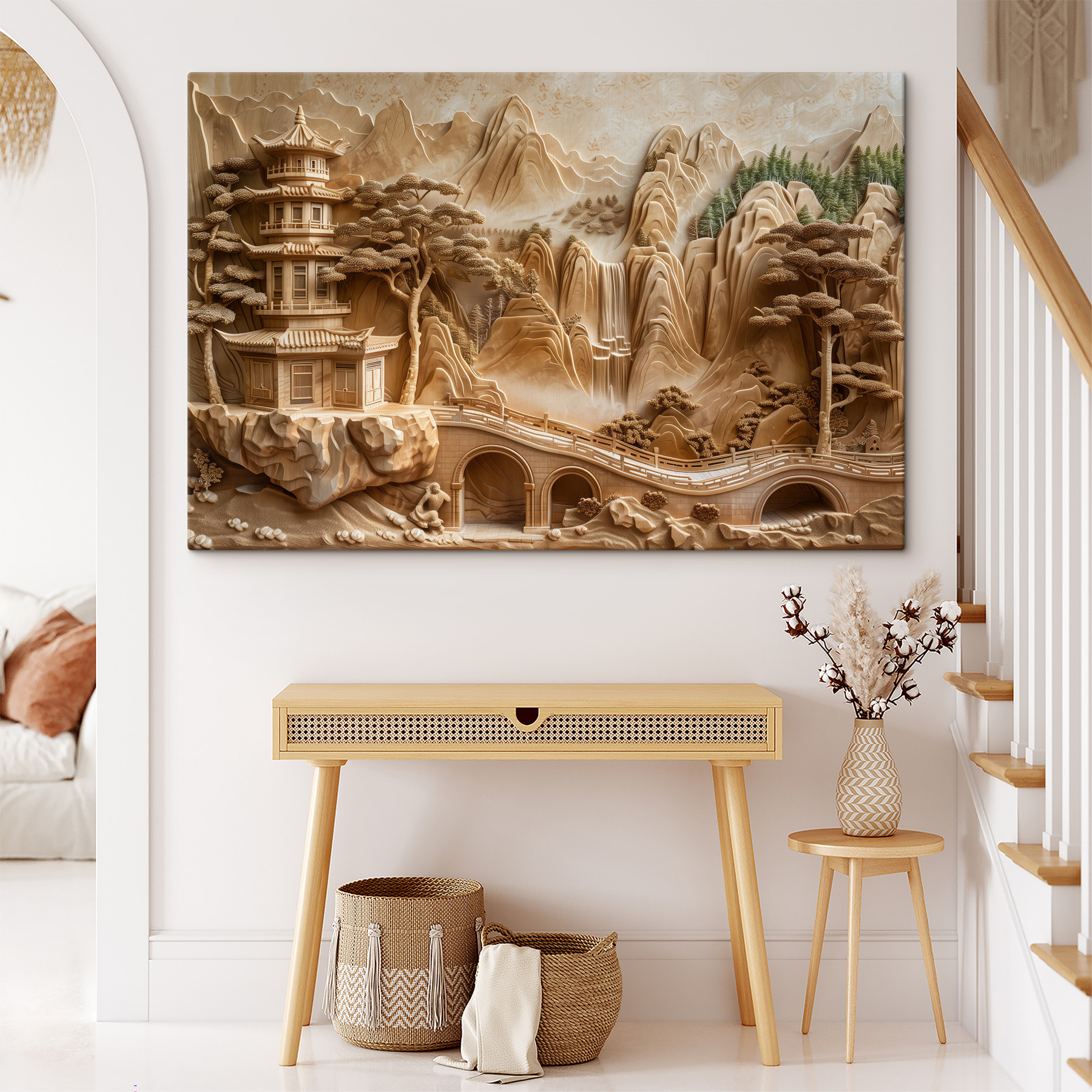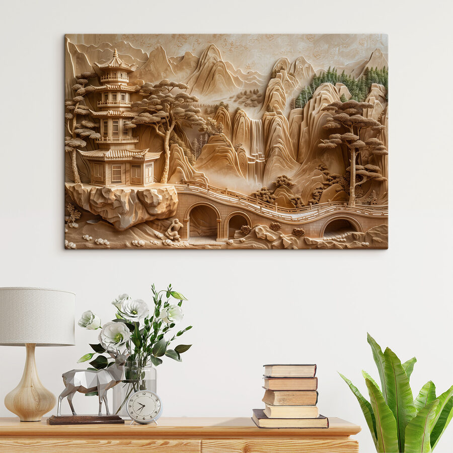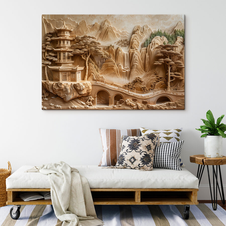Pășiți într-o lume senină cu această imprimare captivantă pe pânză care înfățișează un pod uimitor și o clădire tradițională amplasate printre peisaje luxuriante și liniștite. Imaginați-vă sunetele blânde ale apei care curge în apropiere în timp ce priviți detaliile complexe care dau viață acestei piese. Este ca și cum ai aduce o atingere a frumuseții naturale a Japoniei chiar în casa ta. Perfectă pentru a stârni visele cu ochii deschiși sau pentru a inspira conversații confortabile, această piesă de artă invită la calm și uimire. Plasarea ei într-o cameră de zi sau într-un spațiu de lucru transformă atmosfera, făcând orice zi puțin mai luminoasă. Fie că este pentru propriul spațiu sau pentru un cadou grijuliu, această pânză adaugă acel strop perfect de natură și cultură. Cine nu și-ar dori să evadeze în această scenă încântătoare?