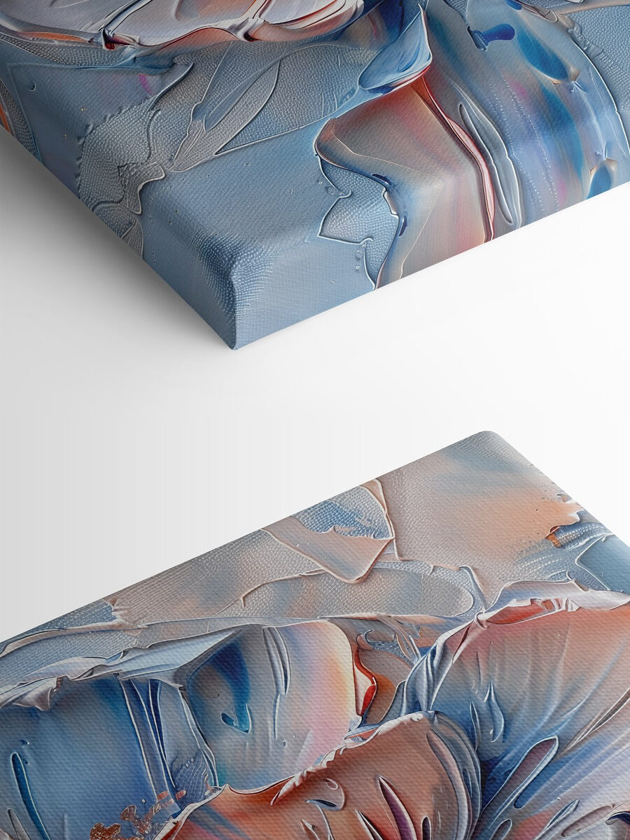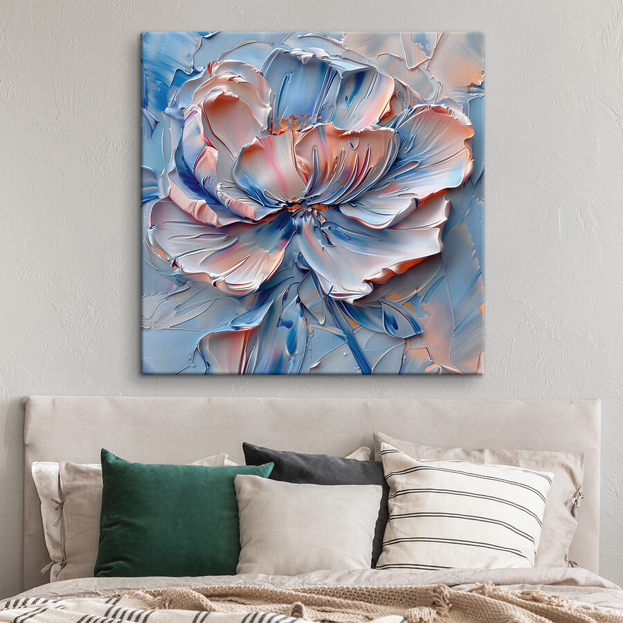 Imaginați-vă că intrați într-o cameră și sunteți întâmpinați de eleganța senină a “Bloom in Cool Tones”. Această pânză nu stă doar pe perete – dansează, cu albastru rece și note calde care se îmbină ca o surpriză perfectă. Are o energie aparte, aproape ca și cum floarea și-ar șopti propriile secrete. Este genul de artă care te face să te oprești, poate chiar să-ți mai torni o ceașcă de ceai doar ca să stai și să privești puțin mai mult. Ideală pentru acei pereți goi care tânjesc după o notă de fantezie și căldură. Perfect pentru a stârni conversații și a calma sufletul.