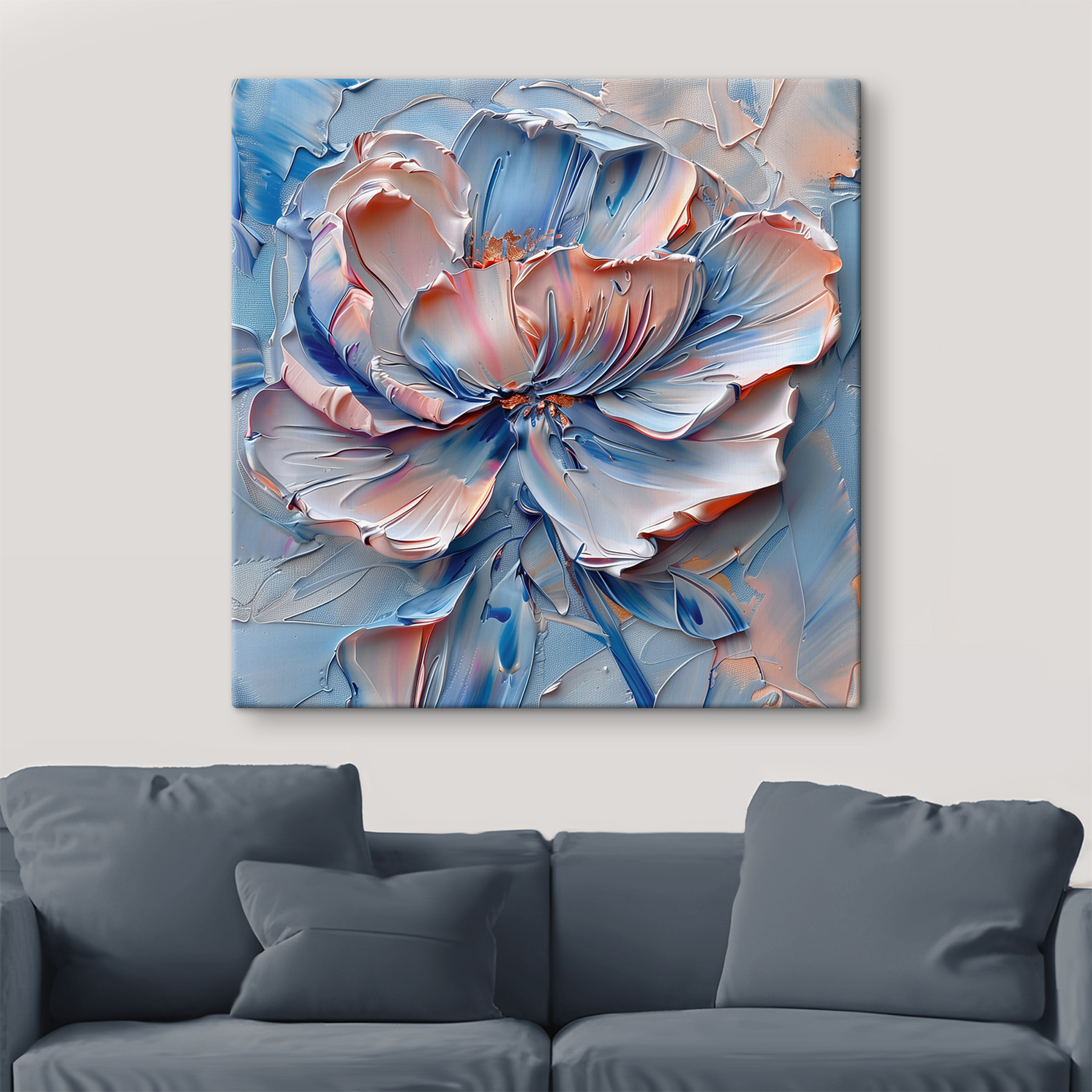 Imaginați-vă că intrați într-o cameră și sunteți întâmpinați de eleganța senină a “Bloom in Cool Tones”. Această pânză nu stă doar pe perete – dansează, cu albastru rece și note calde care se îmbină ca o surpriză perfectă. Are o energie aparte, aproape ca și cum floarea și-ar șopti propriile secrete. Este genul de artă care te face să te oprești, poate chiar să-ți mai torni o ceașcă de ceai doar ca să stai și să privești puțin mai mult. Ideală pentru acei pereți goi care tânjesc după o notă de fantezie și căldură. Perfect pentru a stârni conversații și a calma sufletul.
