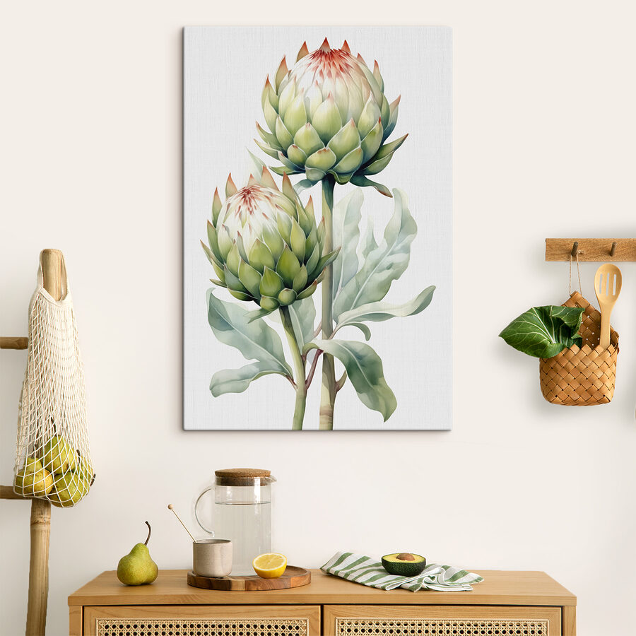 Faceți cunoștință cu “Tablouri Twin Artichokes Basking in Harmony” – o explozie încântătoare de natură care-și croiește drum spre inima dumneavoastră. Imaginați-vă aceste două anghinare excentrice având o discuție confortabilă în acuarelă! Această piesă, cu verdele său moale și șoaptele de căldură, adaugă o notă de fantezie oricărui spațiu. Imaginați-vă-o în bucătăria dvs., stârnind bucurie și poate o poftă pentru ceva delicios. Este ca un prieten blând, care înviorează fără efort camera cu farmecul naturii. Perfect pentru cei care iubesc un pic de personalitate și o notă de neașteptat.