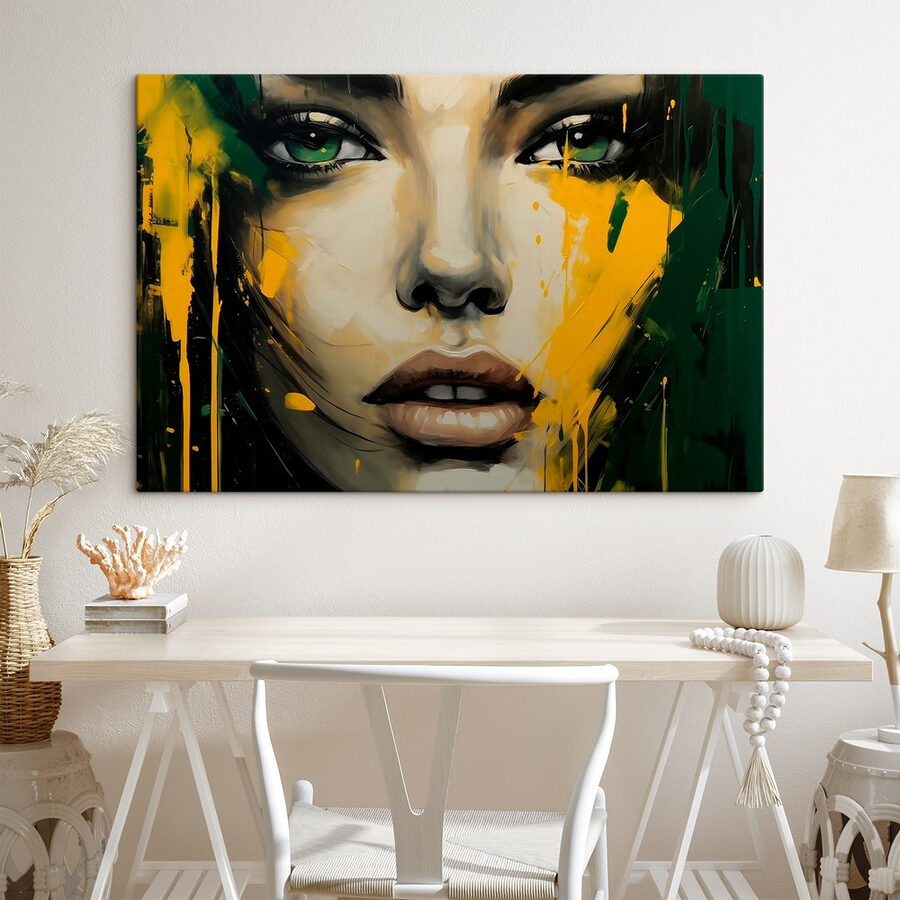 Scufundați-vă în lumea culorilor vii și a emoțiilor intense cu această “Pictură pe pânză a feței unei femei”. Nu este o piesă obișnuită de artă murală – este ceva de genul privirii într-un vis frumos și haotic. Ochii ei par să te urmărească, nu-i așa? Perfect pentru acei pereți goi care au nevoie de o scânteie conversațională. Oamenii s-ar putea trezi visând cu ochii deschiși doar uitându-se la ea sau meditând la misterele vieții în timp ce își sorb cafeaua de dimineață. Cine ar fi crezut că o pată de culoare și o privire captivantă pot face atât de multe? Agățați-o, admirați-o, lăsați-o să vă hipnotizeze ziua.