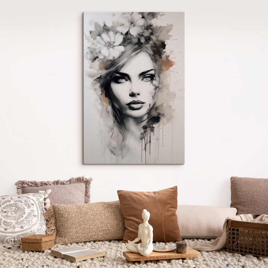 Imaginați-vă acest lucru: o piesă izbitoare care șoptește eleganță cu o notă de mister. Faceți cunoștință cu pânza unei femei încoronate cu flori, toate în tonuri moi de alb și negru. Este ca și cum te-ar privi drept în ochi, atrăgându-te în lumea ei calmă, dar intrigantă. Perfectă pentru cei care adoră poveștile și emoțiile țesute în artă. Imaginați-vă-o pe perete – poate pentru a decora un colț de lectură confortabil sau pentru a adăuga farmec camerei de zi. Este un starter de conversație, un creator de atmosferă. Absolut atemporal, cu o notă de fantezie.