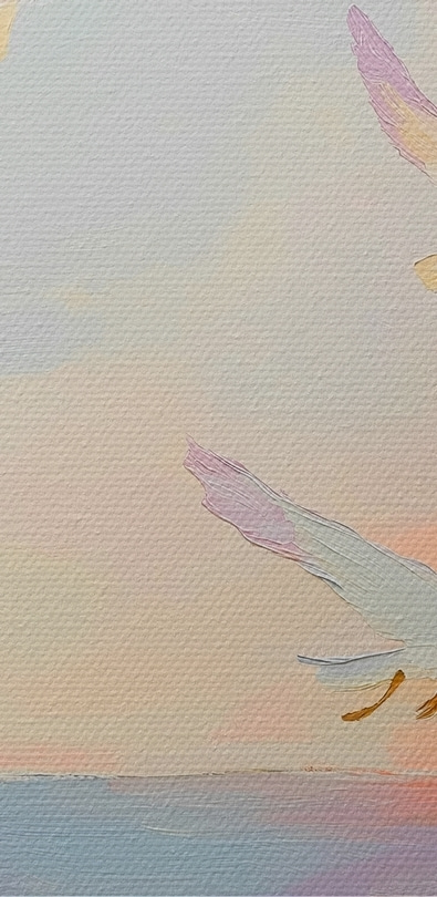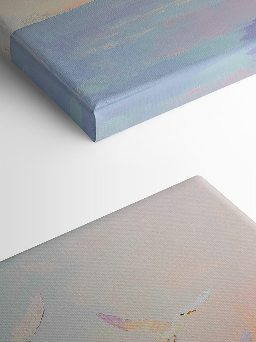 Imaginați-vă acest lucru: păsări plonjând grațios pe un cer de vis în amurg, aripile lor agitând apele pastelate de dedesubt. Acest print pe pânză este ca o gură de aer proaspăt pentru pereții dvs. – perfect pentru un spațiu care tânjește după un pic de seninătate cu un strop de fantezie. Este ca și cum ai surprinde un moment magic, chiar înainte ca marea să șoptească secretele soarelui la apus. Atârnă-l și, dintr-o dată, camera ta se simte ca o escapadă confortabilă pe ocean. Este o artă care te face să te oprești, să zâmbești și poate să îți dorești să poți zbura și tu.