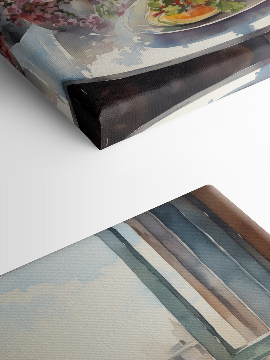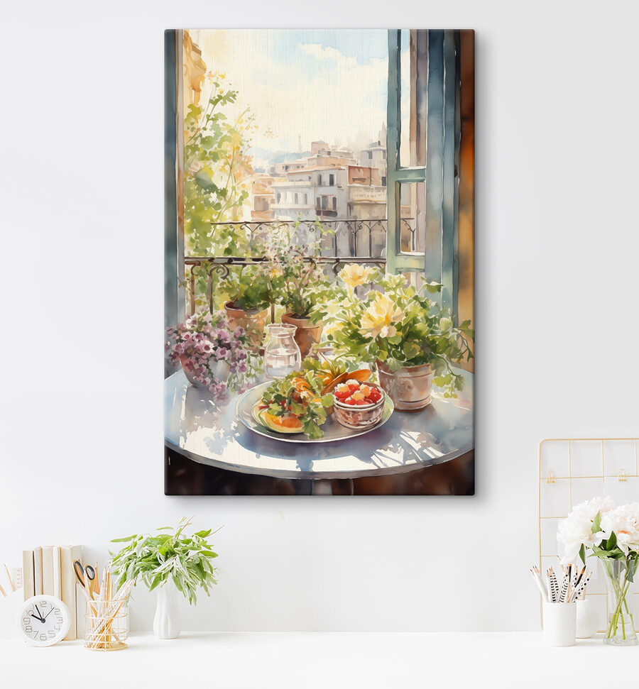 Imaginați-vă acest lucru: o duminică dimineața leneșă cu cafea și această pânză vibrantă pe perete. Este ca și cum ai păși într-o cafenea fermecătoare, cu lumina soarelui revărsându-se prin fereastră pe o masă plină de flori și fructe în acuarelă. Perfectă pentru a insufla viață și culoare în orice cameră – gândiți-vă la ea ca la o mini evadare de fiecare dată când aruncați o privire în direcția ei. Detaliile par aproape palpabile, de parcă ai putea culege un fruct suculent chiar de pe farfurie. Un starter de conversație cu siguranță, care stârnește vise de după-amieze confortabile și aventuri artistice.