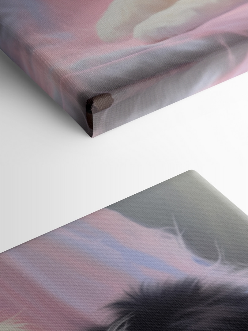 Această imprimare fermecătoare pe pânză a unei pisici albe și negre care se relaxează pe o pătură roz pufoasă este o încântare pură. Imaginați-vă acest prieten felin observând în liniște năzbâtiile dvs. zilnice, cu acei ochi mari și curioși. Acesta aduce un vibe confortabil și jucăuș, care poate înveseli instantaneu orice cameră. Perfect pentru un colțișor al unui iubitor de pisici sau pentru o cameră de copii – ar putea chiar încuraja niște șoareci de jucărie să iasă la joacă! Culorile moi și detaliile complicate creează o atmosferă caldă, invitând la îmbrățișări și momente plăcute. Este ca și cum ai avea o bucățică de seninătate liniștită chiar pe peretele tău!