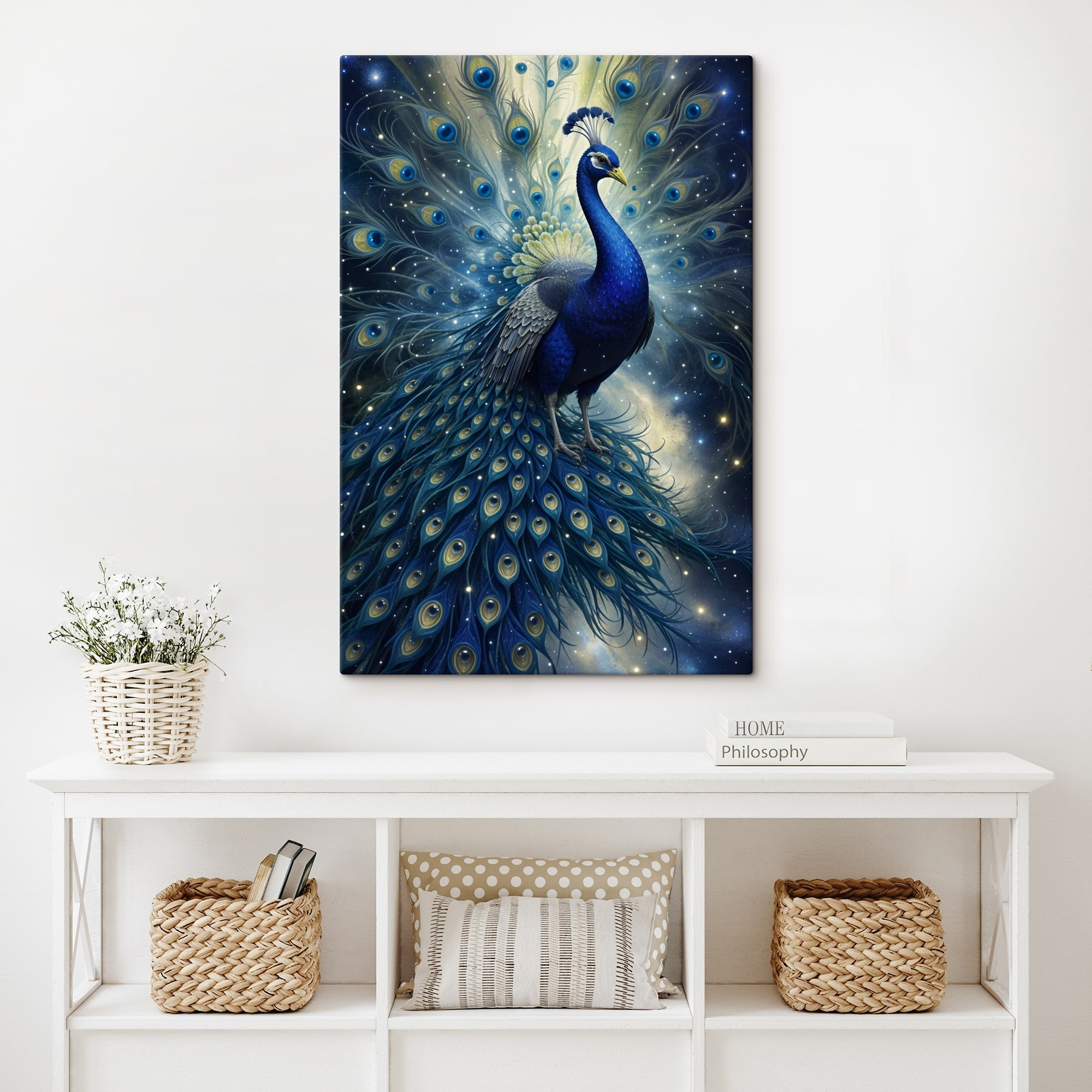 Faceți cunoștință cu o imprimare uimitoare pe pânză care cu siguranță va transforma orice spațiu într-un refugiu capricios. ‘Majestic Feathers in Cosmic Harmony’ vă invită într-un univers în care albastrul vibrant se amestecă cu eleganța fermecătoare a penelor de păun. Imaginați-vă că intrați într-o cameră și simțiți instantaneu un val de calm și inspirație, toate datorită acestei piese extraordinare.