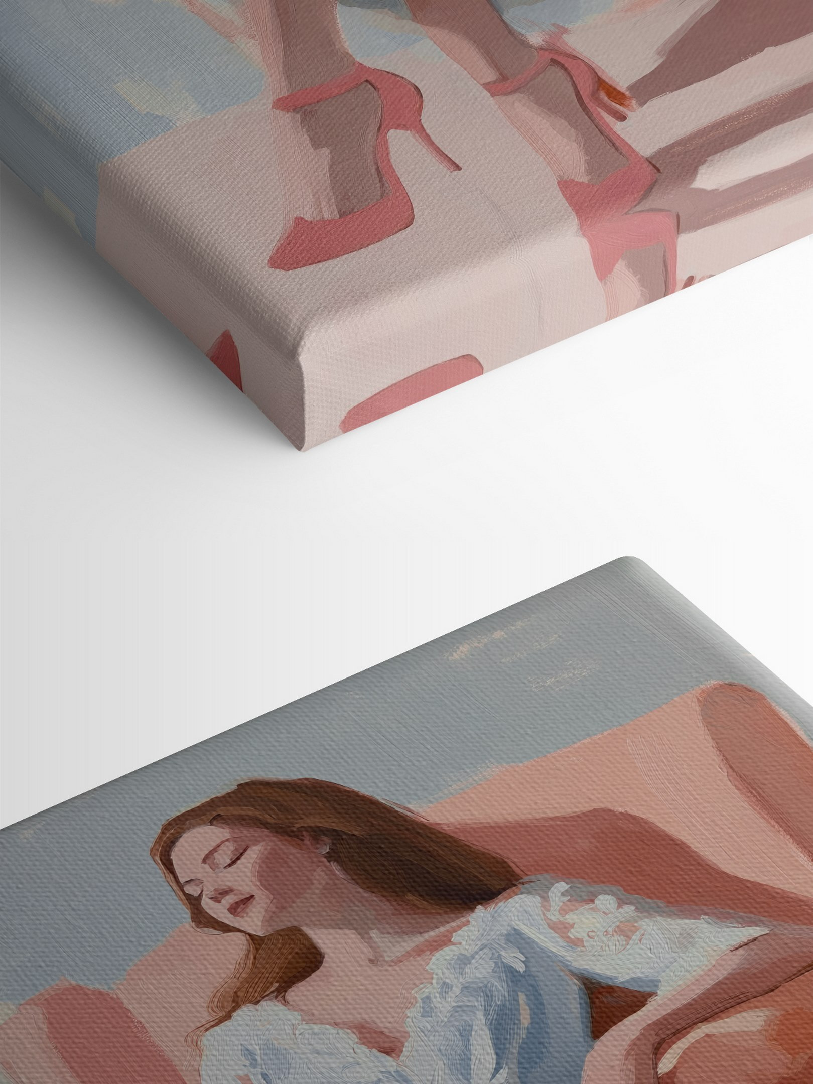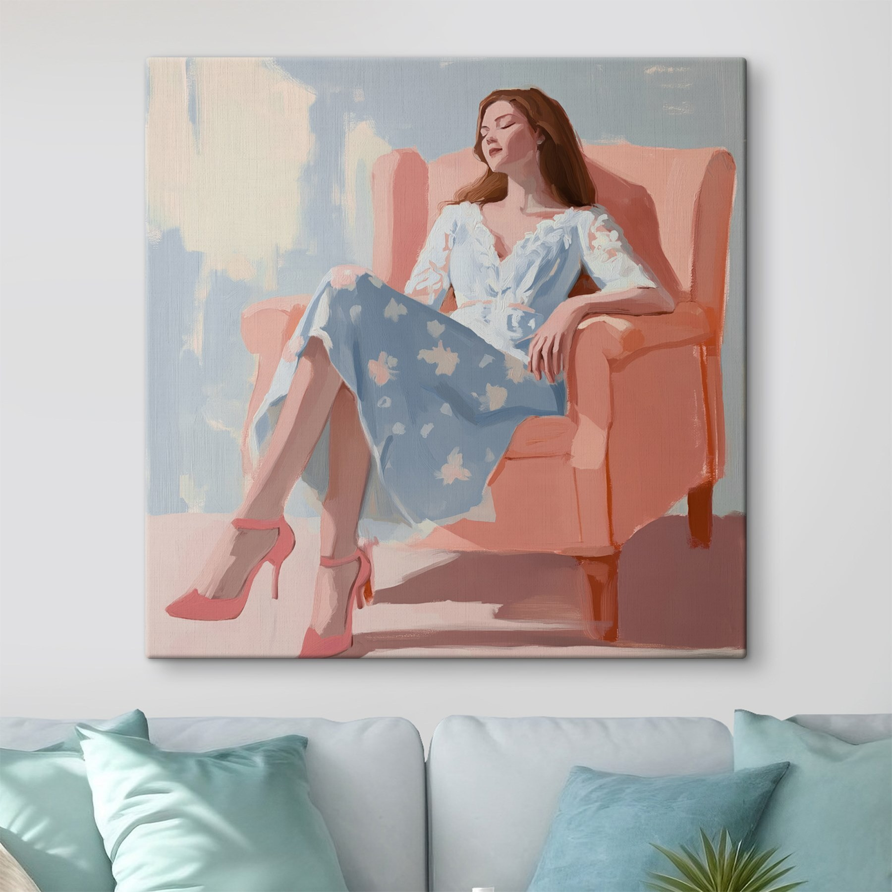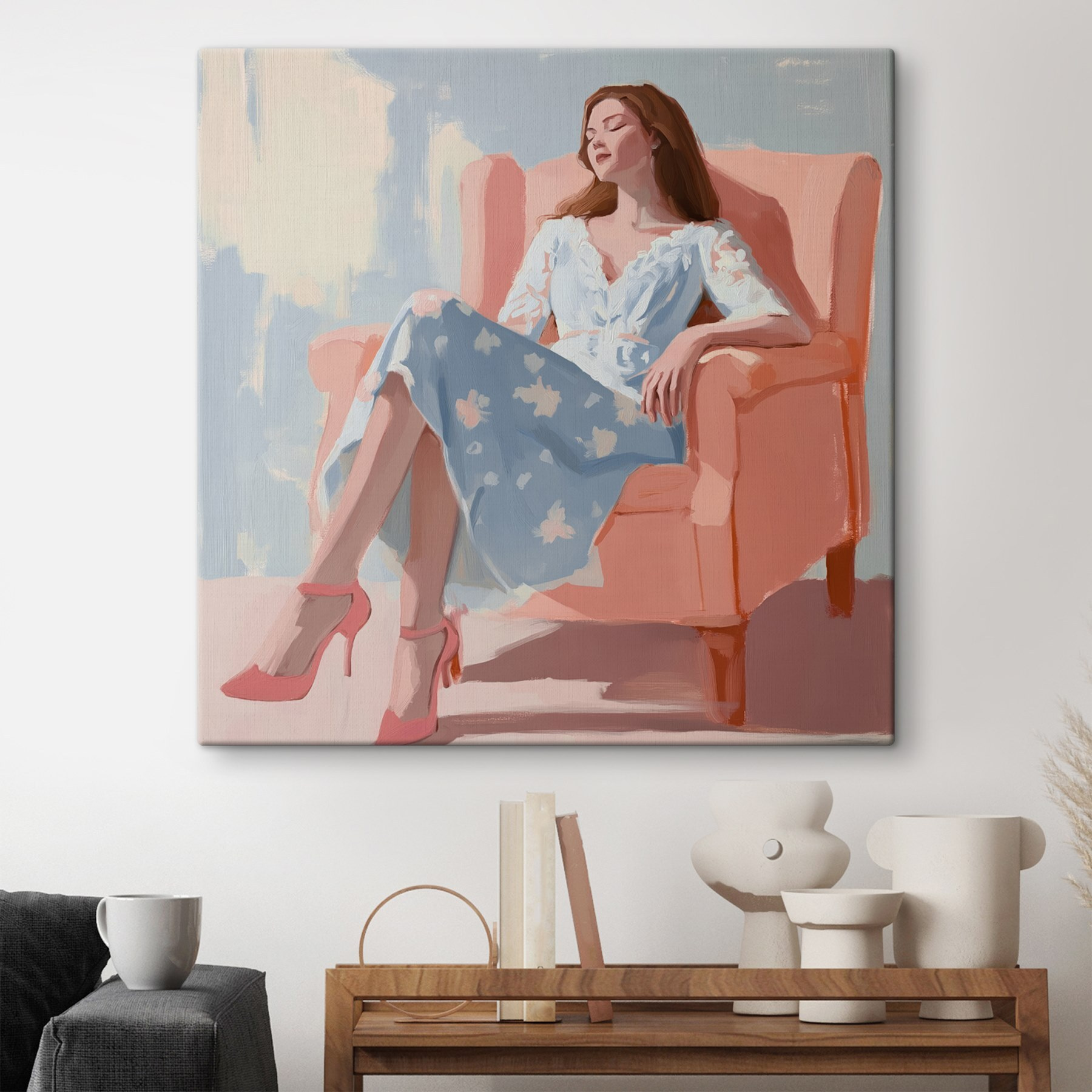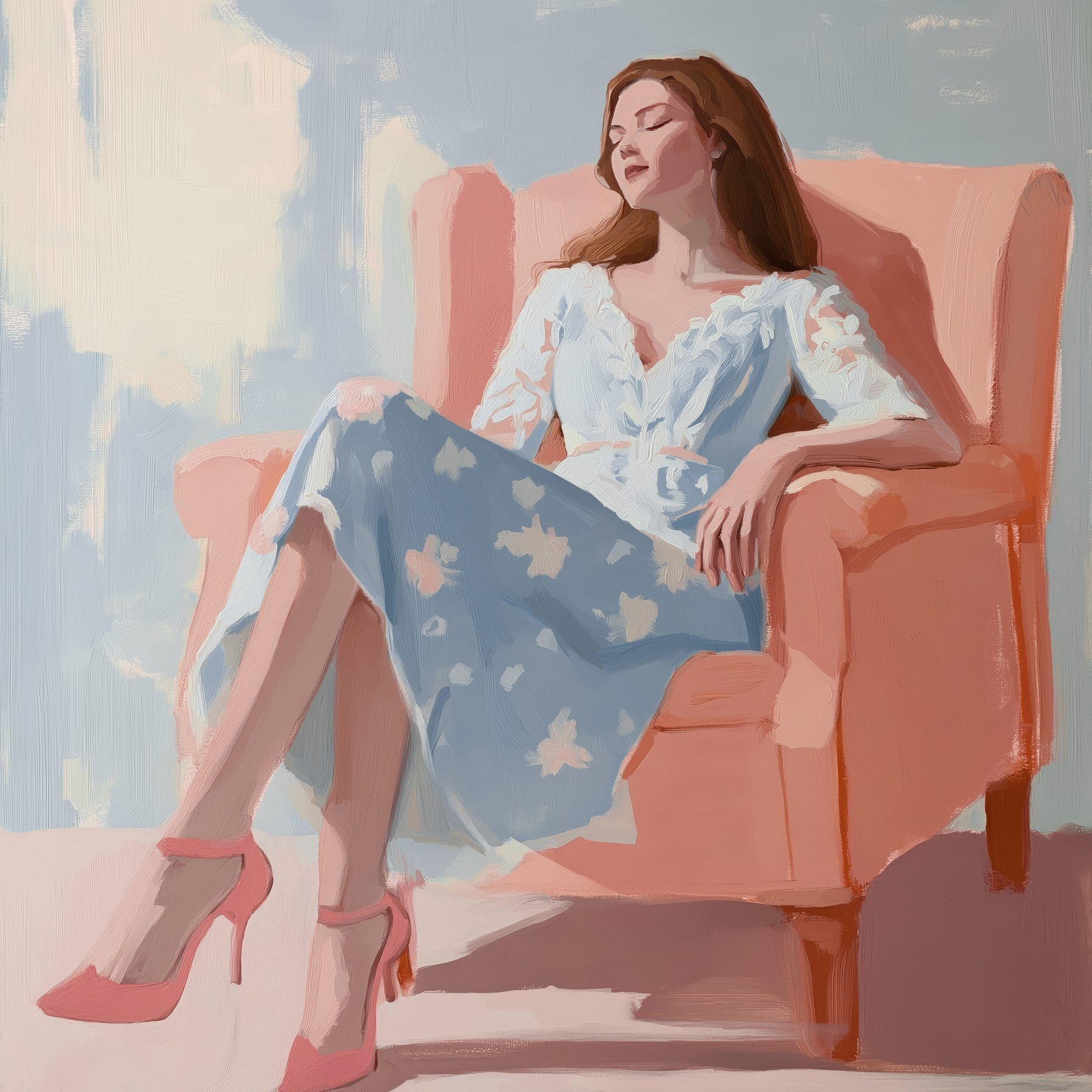 Imaginați-vă această pânză: o femeie relaxată pe un scaun, eleganță pură cu un strop de visare cu ochii deschiși. Culorile pastelate se îmbină delicat, creând un sentiment de calm care te face să vrei să te cuibărești cu o carte bună. Perfectă pentru un colțișor liniștit sau pentru sanctuarul dormitorului, ea șoptește seninătate cu un strop de sofisticare. S-ar putea să te trezești privind-o, pierdut în gânduri – întrebându-te la ce se gândește sau poate doar meditând la planurile pentru cină. Este o artă care adaugă un strop de farmec și intrigă oricărei camere.