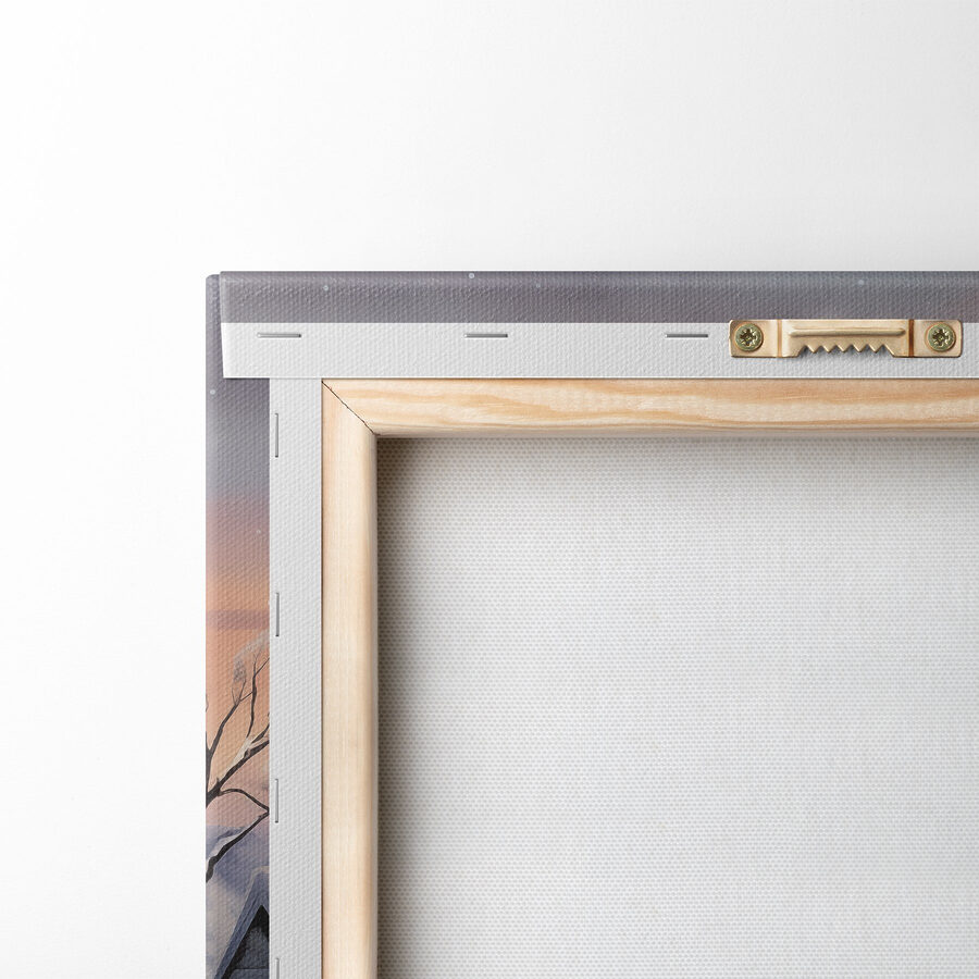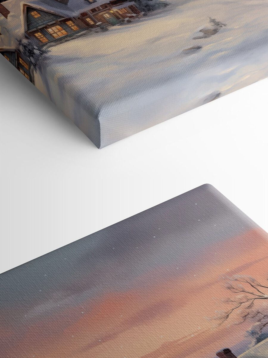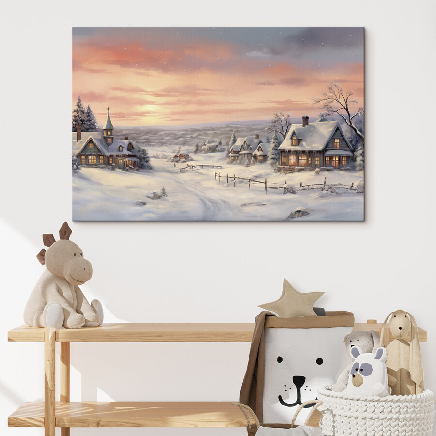 Imaginați-vă că vă așezați într-un fotoliu confortabil, cu o cană de cacao fierbinte în mână, în timp ce priviți scena unui sat înzăpezit care pare desprins direct din țara minunilor de iarnă. Această imprimare pe pânză surprinde un moment senin în care casele, acoperite cu zăpadă pufoasă, par să șoptească povești despre focuri calde și veselie de sărbători. Nuanțele blânde ale apusului de soare din spatele vârfurilor pictează o imagine a liniștii. Fiecare detaliu invită la visare cu ochii deschiși, la sorbit cidru condimentat sau la construirea unui om de zăpadă. Este ca și cum ai aduce o atingere a frigului și farmecului naturii în interior, perfect pentru a adăuga căldură oricărui perete. Cine nu și-ar dori o amintire zilnică a unei astfel de frumuseți pașnice?